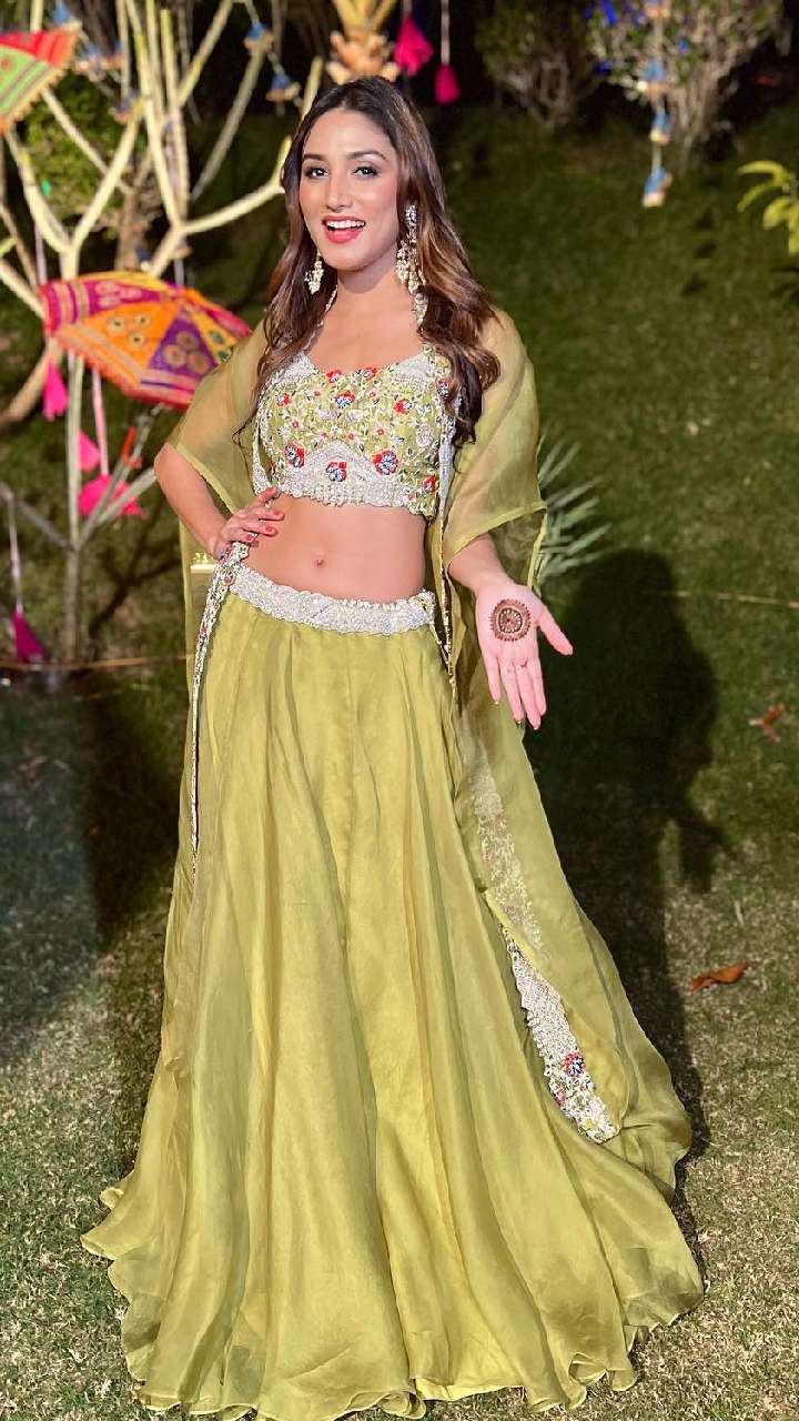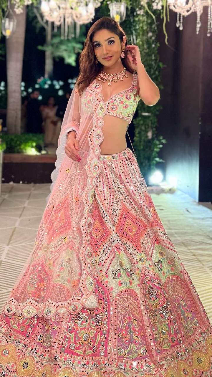 अभिनेत्री का मल्टीकलर लहंगा डीप नेक कट स्लीव्स चोली बेहद हॉट लुक दे रही हैं। आप भी उनके इस लुक से आइडिया ले सकती हैं।