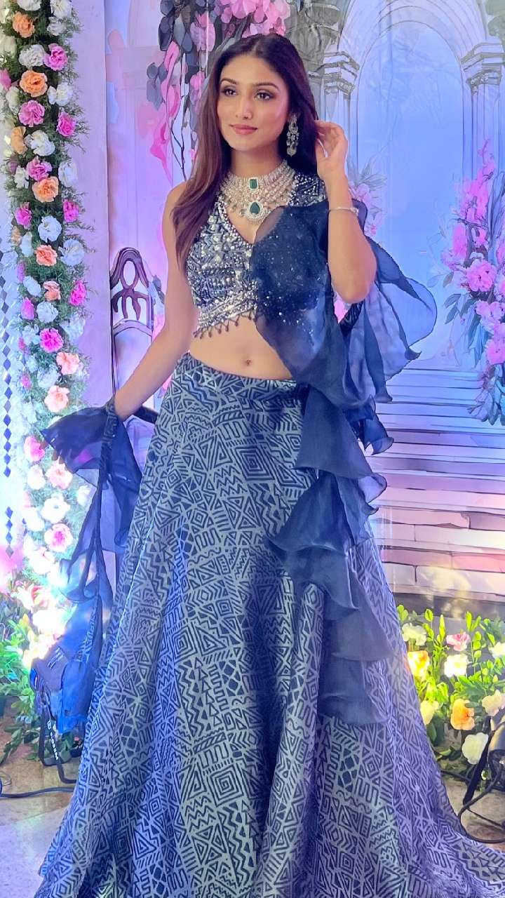 अभिनेत्री ने हाल में इंस्टाग्राम पर ब्लू कलर के प्रिंटेड सिल्क लहंगे हैवी वर्क वी नेक चोली में अपना खूबसूरत लुक शेयर किया है। इसके साथ हैवी सिल्वर नेकपीस कहर ढहा रहा है।