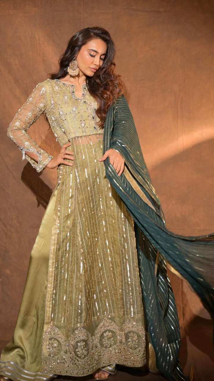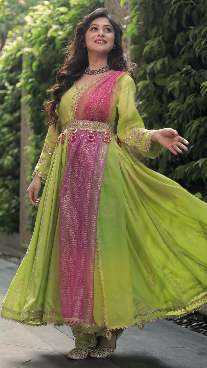 फलक ग्रीन कलर के हैवी फ्लेयर अनारकली सूट पिंक दुपट्टे को गॉर्जियस लग रही हैं। दुपट्टे को उन्होंने बेल्ट से टक किया हुआ है।