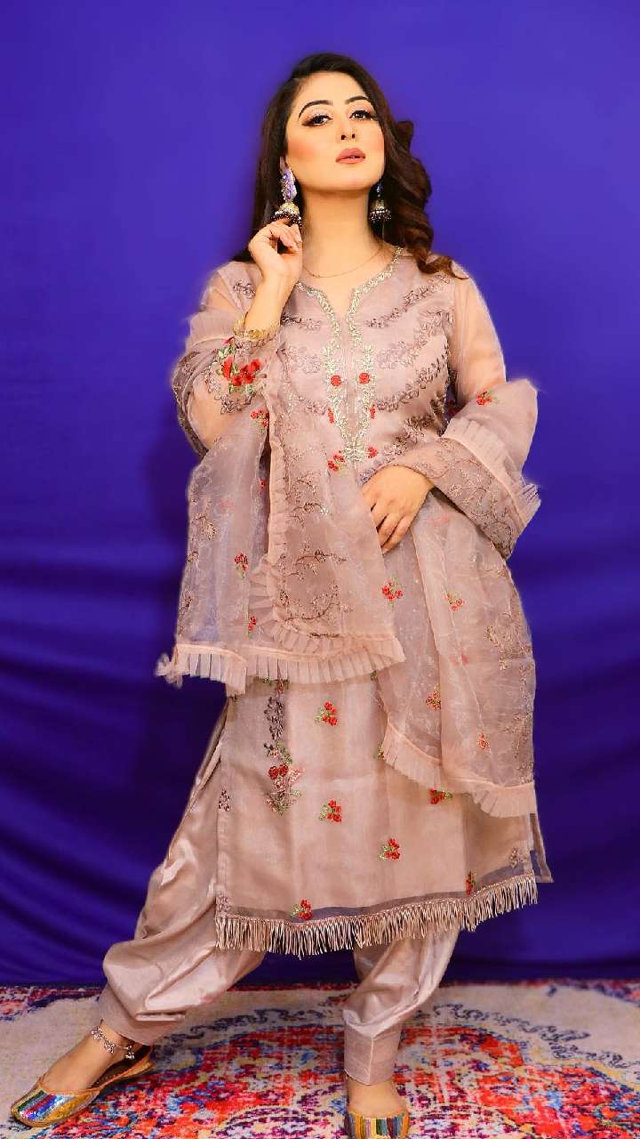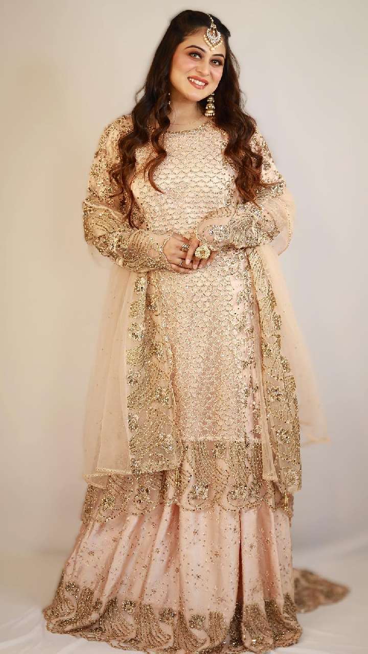 फलक नाज का पिंक हैंड एम्ब्रॉडयरी वर्क हैवी घेर शरारा सूट एलिगेंट लुक दे रहा है। फेयर स्किन टोन गर्ल्स इसे स्टाइल कर सकती हैं।