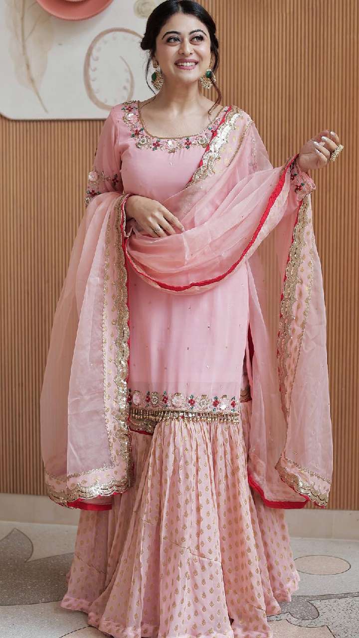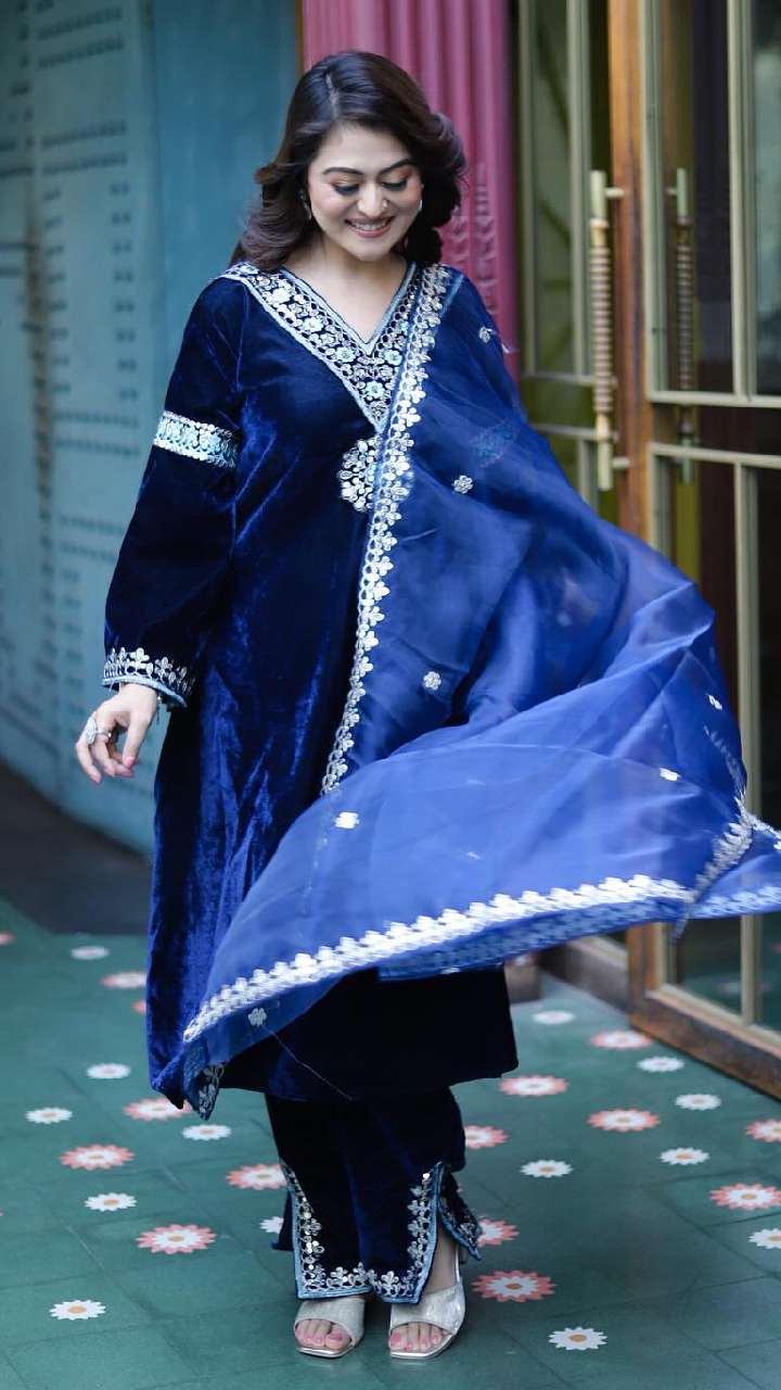 ब्लू कलर के सिल्वर वर्क प्लाजो सूट में एक्ट्रेस गॉर्जियस लग रही हैं। वलीमा के लिए ये बेस्ट ऑप्शन है।