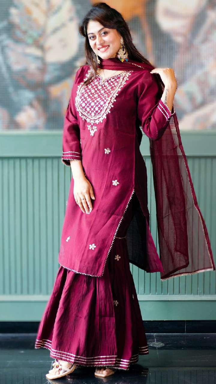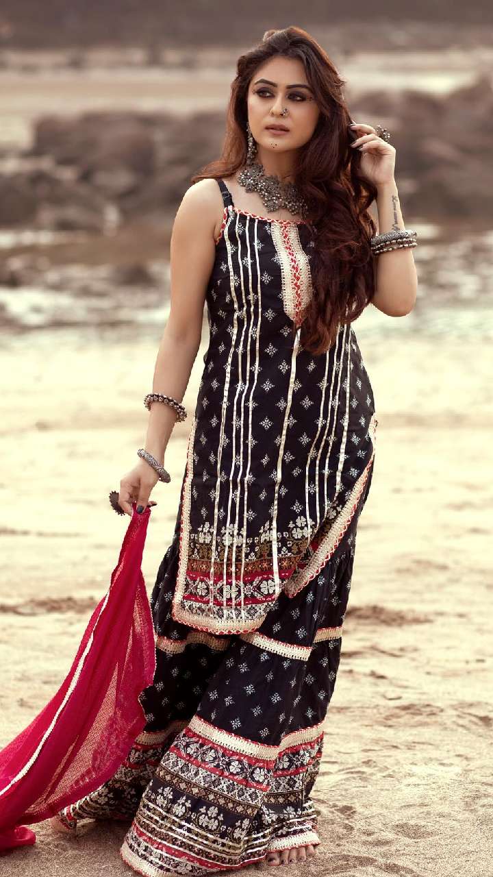 वलीमा पार्टी में फलक नाज का पर्पल कॉटन शरारा सूट आपको चांद सा नूर देगा। ऐसे में आप इसे भी कॉपी कर सकती हैं।