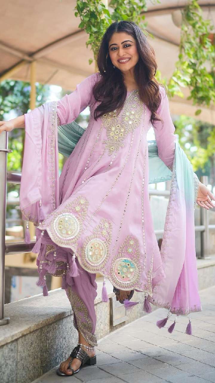 आजकल इस तरह के धोती स्टाइल सूट काफी ट्रेंड में हैं। ऐसे में एक्ट्रेस का मिरर वर्क लेवेंडर सूट कैरी करके खूबसूरत दिख सकती हैं।