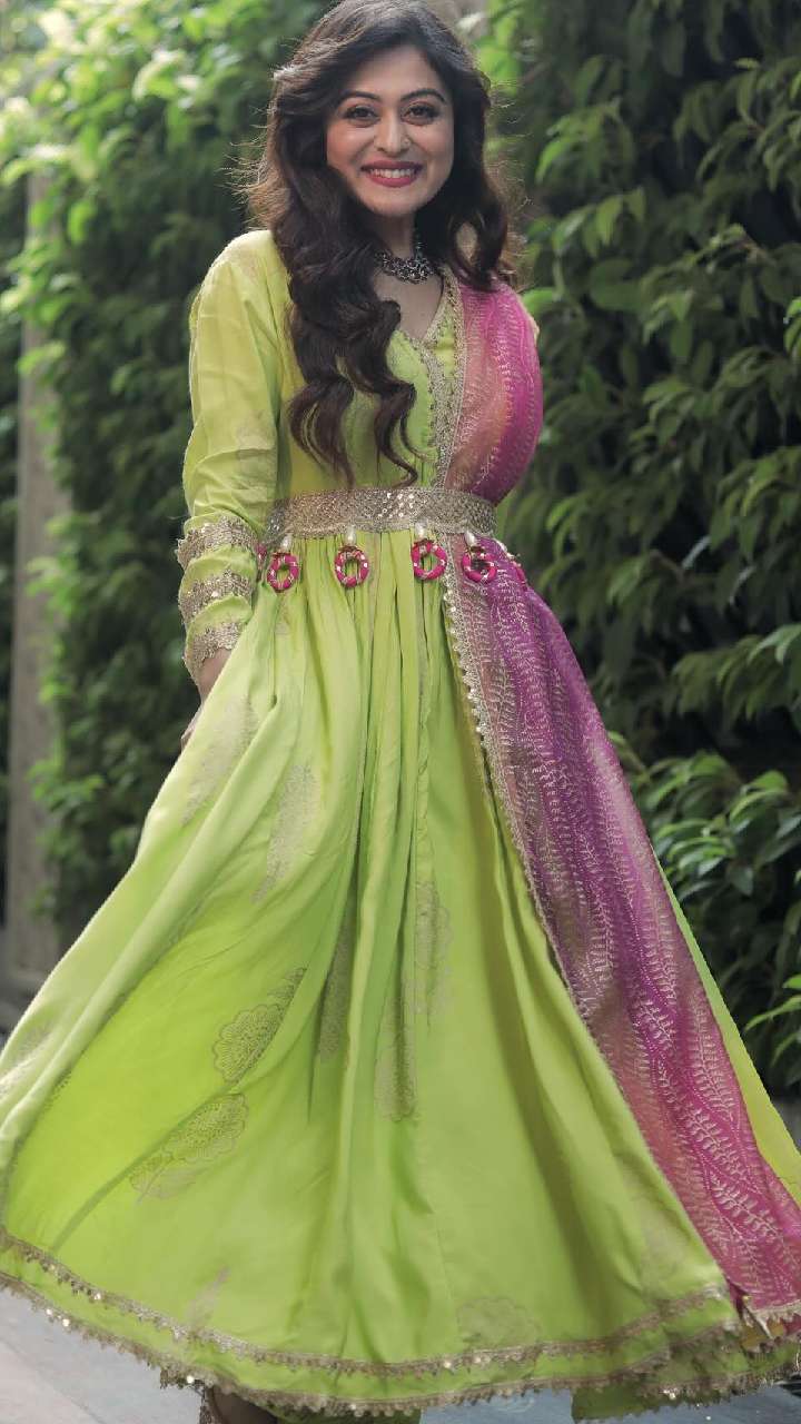 अभिनेत्री व्हाइट कलर के गोटा वर्क फ्रंट कट अनारकली सूट में कहर ढहा रही हैं। आप भी इसे कैरी करके खुद को रॉयल लुक दे सकती हैं।