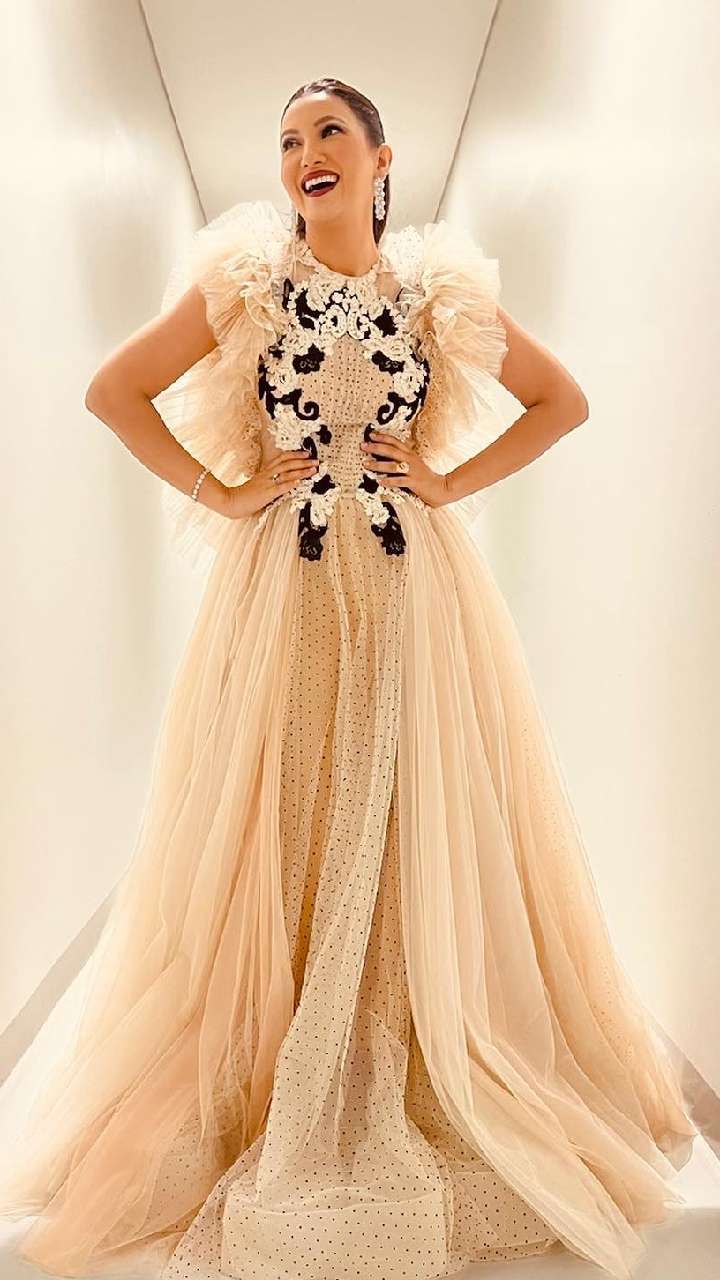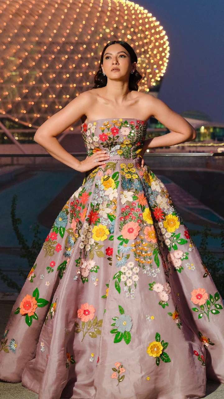 एक्ट्रेस इस बेज कलर के फ्लोरल प्रिंट ऑफ शोल्डर इवनिंग गाउन में बेहद ग्लैमरस लुक दे रही हैं।
