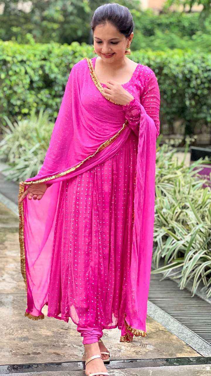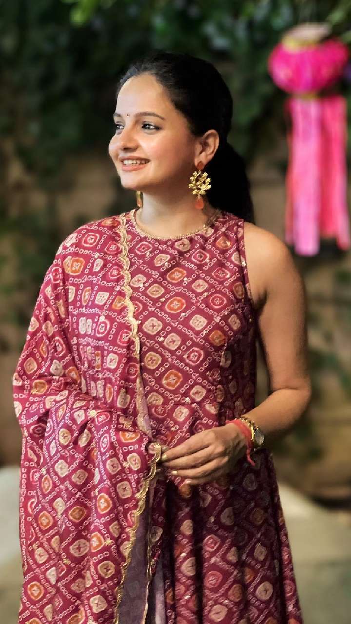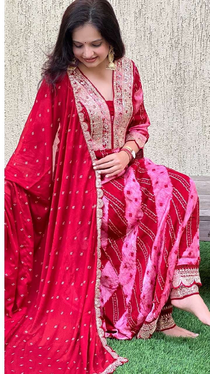 नई दुल्हन पर लाल रंग के सूट खूब खिलते हैं। ऐसे में आप एक्ट्रेस के जैसे रेड पिंक लहरिया अनारकली सूट को ट्राई कर सकती हैं। इसके संग सितारों वर्क वाला सिल्क दुपट्टा जंचेगा।