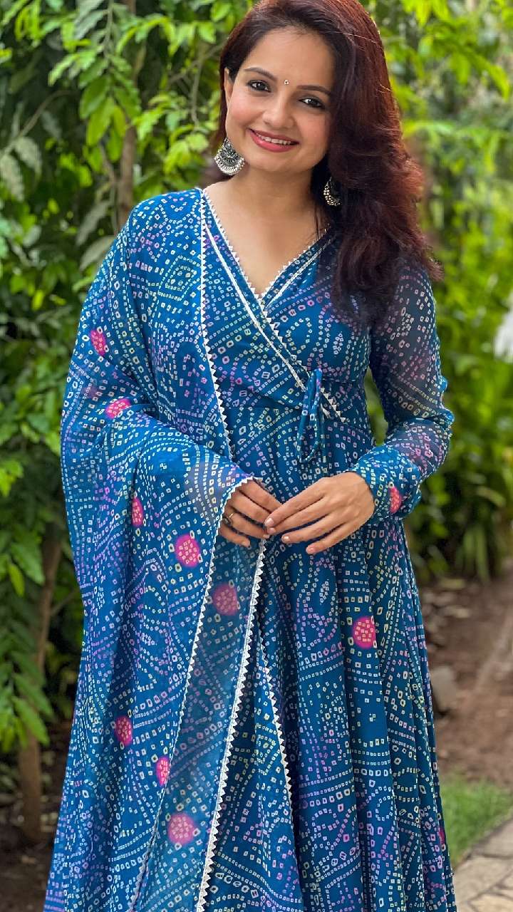 आप ससुराल में डीवा के जैसा बंधेज प्रिंट अंगरखा सूट पहन सकती हैं। इस सूट में आप बेहद खूबसूरत नजर आने वाली हैं।