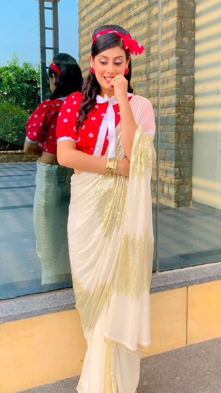 अभिनेत्री व्हाइट कलर की गोल्डन सेक्विन पैच साड़ी रेड कंट्रास्ट ब्लाउज में काफी स्मार्ट लग रही हैं। इसे आप किसी भी फंक्शन में कैरी कर सकती हैं।