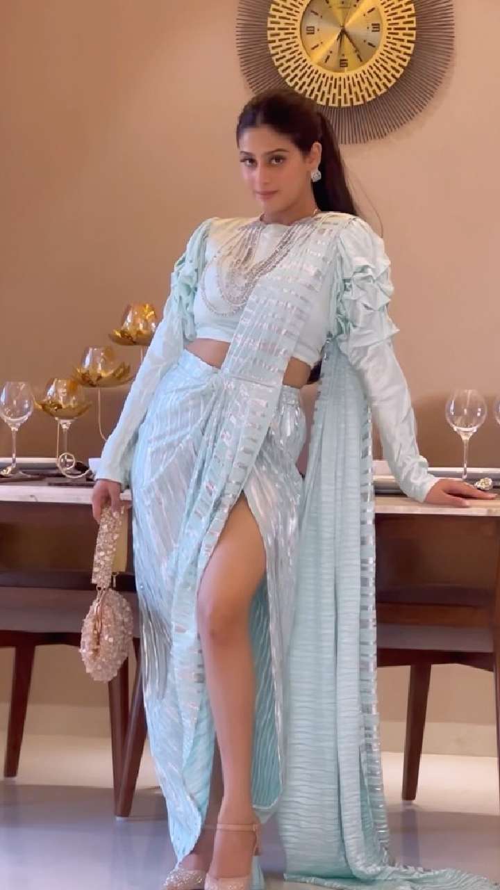 ईशा मालवीय स्काई ब्लू कलर की इंडो-वेस्टर्न साड़ी में काफी मॉडर्न लग रही हैं। साथ में उन्होंने फुल स्लीव्स ब्लाउज पेयर किया हुआ है।