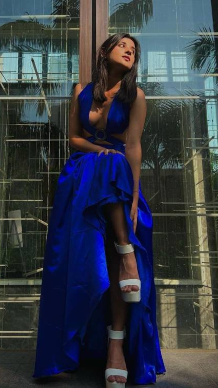 ब्लू कलर की डीप नेक ड्रेस में एक्ट्रेस बेहद हॉट पोज देती नजर आ रही है।