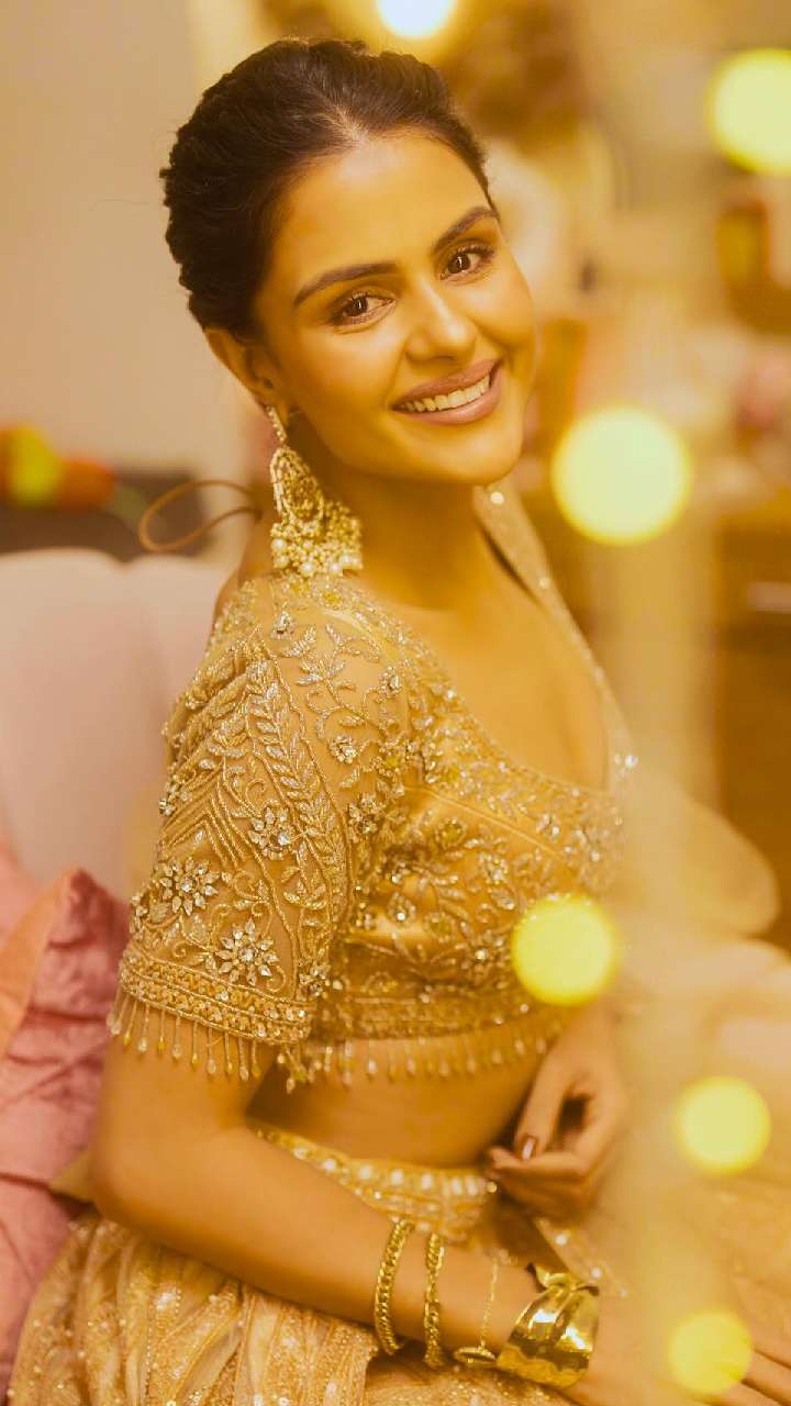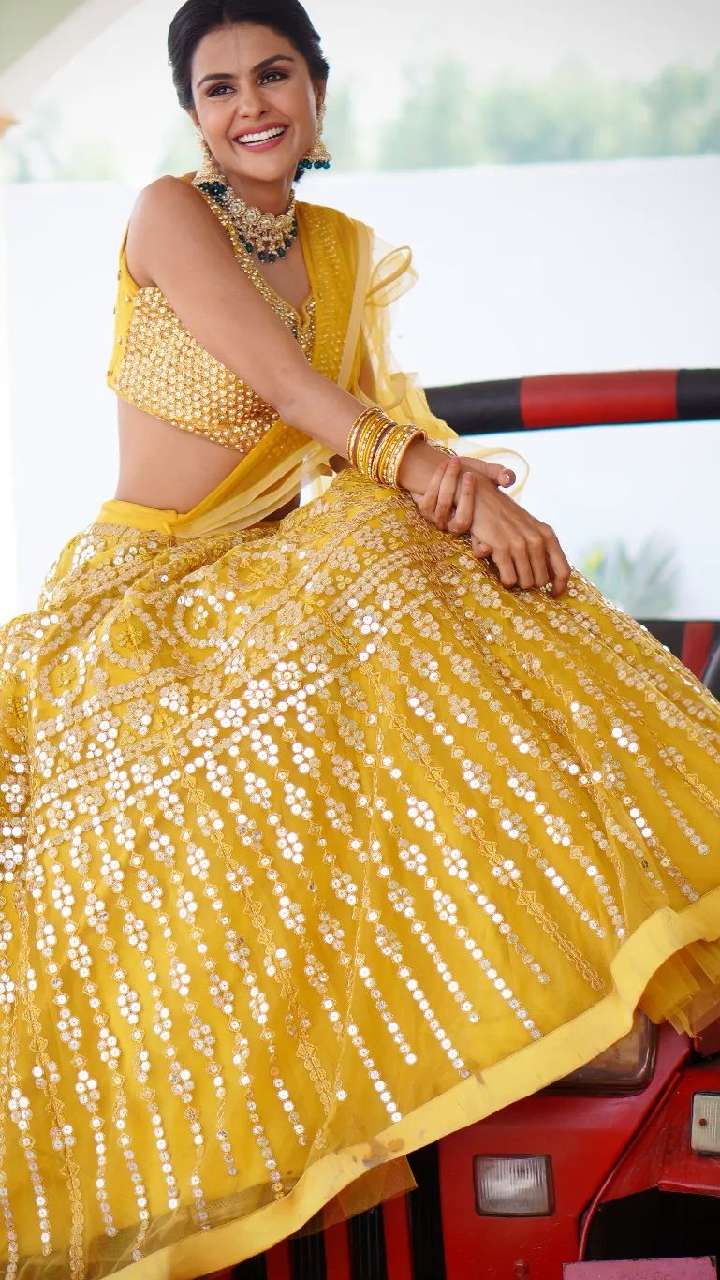एक्ट्रेस के इस मिरर वर्क येलो केन केन लहंगे को आप हल्दी फंक्शन में स्टाइल कर सकती हैं। ये आपको बेहद खूबसूरत बना देगा।