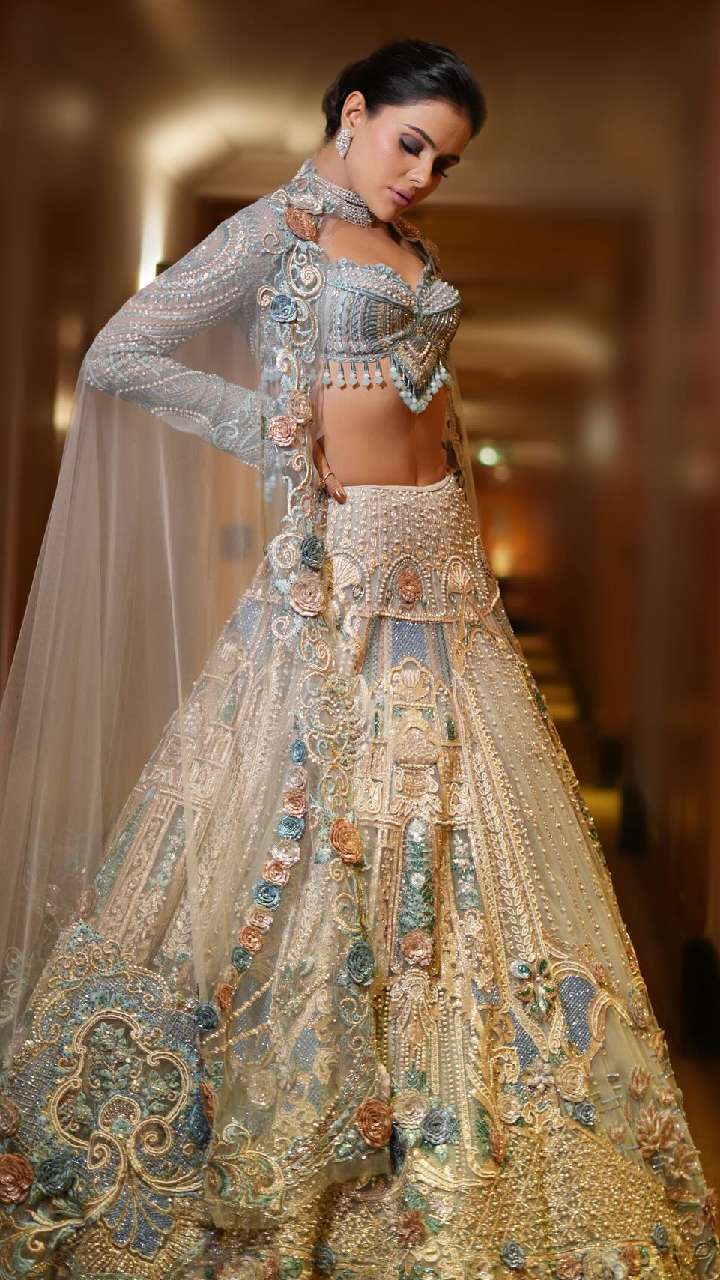 अभिनेत्री का डार्क ब्लू एम्ब्रॉयडरी लहंगा हैवी कट दाना वर्क डीपनैक चोली लुक आपके वेडिंग लुक को एकदम गॉर्जियस बना देगा।