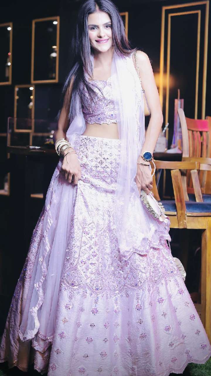 आजकल सेक्विन लहंगे काफी ट्रेंड में हैं। ऐसे में आप प्रियंका चाहर चौधरी के इस लाइट कलर ग्लिटरी लहंगे कट स्लीव्स चोली को कैरी कर सकती हैं।