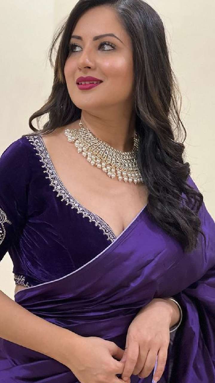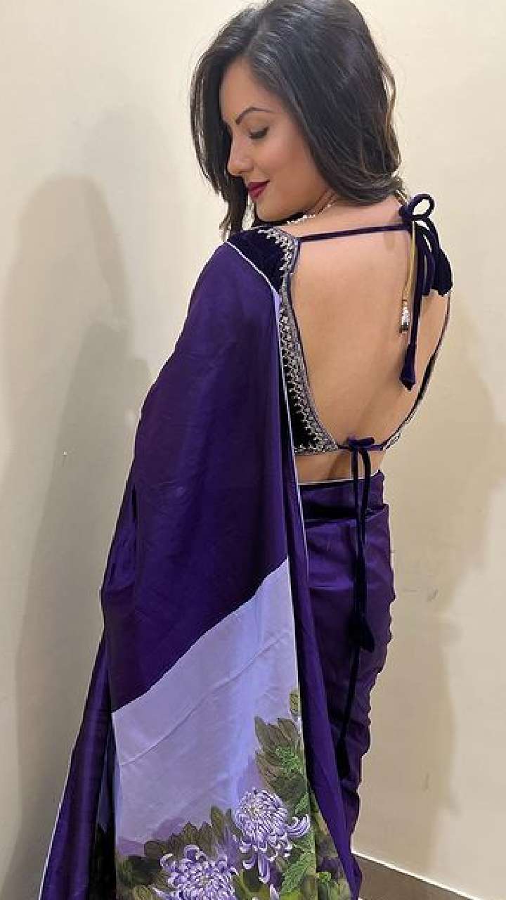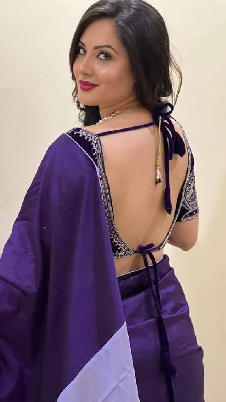 पूजा बेनर्जी ब्लू प्रिंडेट साड़ी में बला की खूबसूरत लग रही हैं।