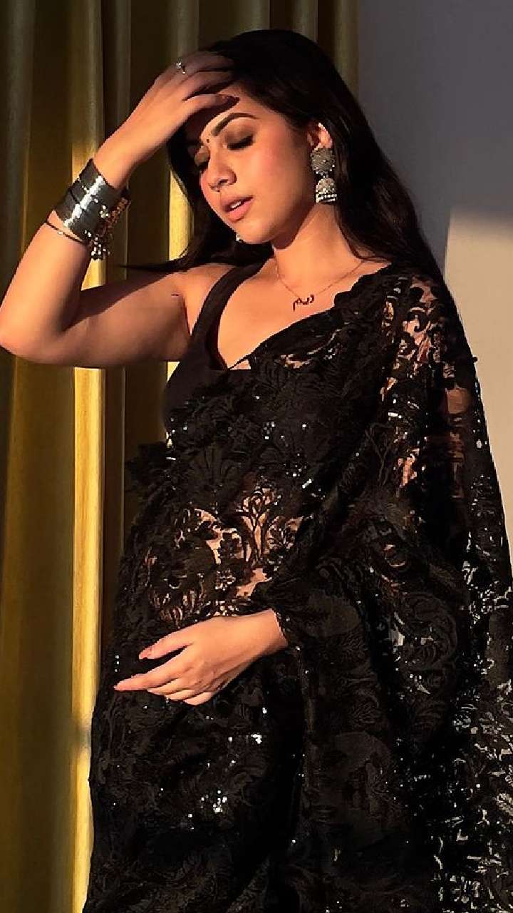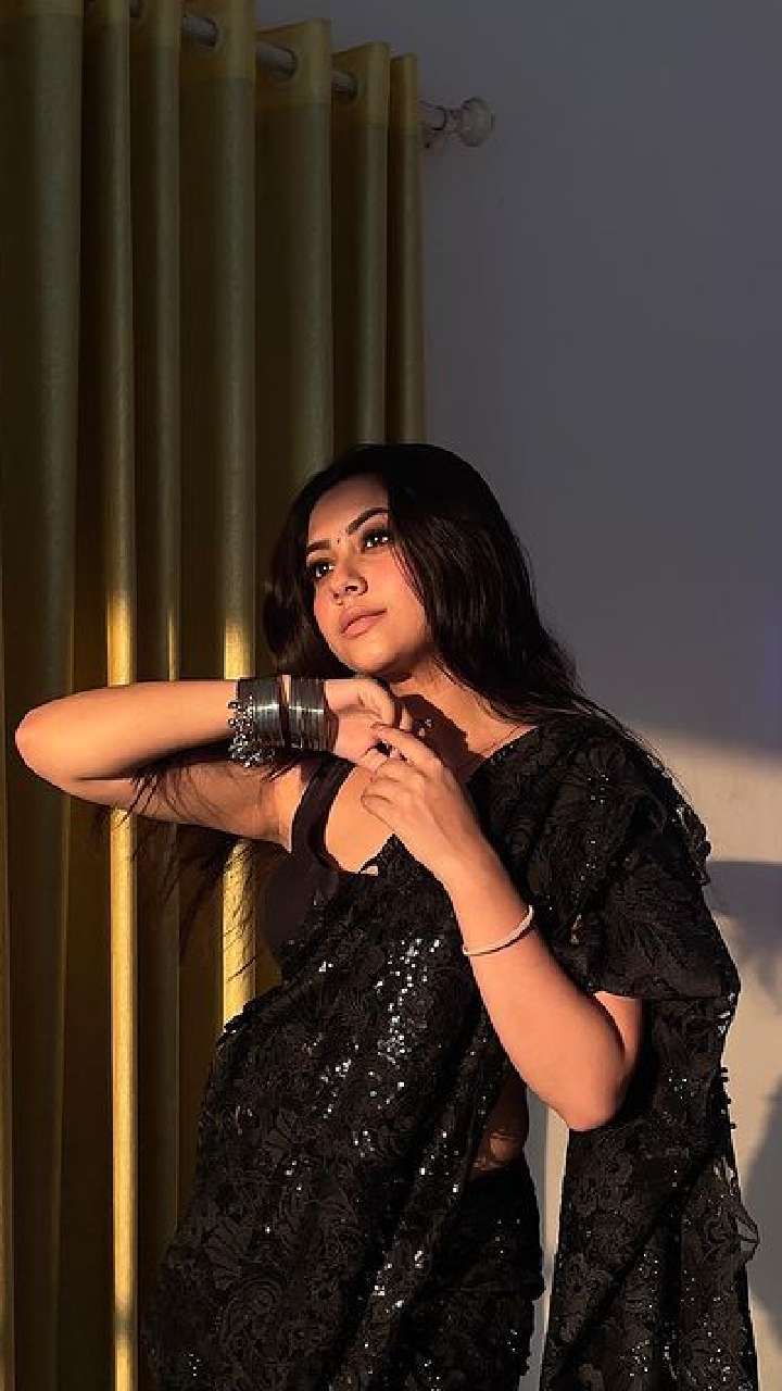रीम समीर शेख की यह ट्रांसपेरेंट ब्लैक साड़ी काफी हॉट लुक दे रही है। यह साड़ी कॉकटेल पार्टी के लिए परफेक्ट है।