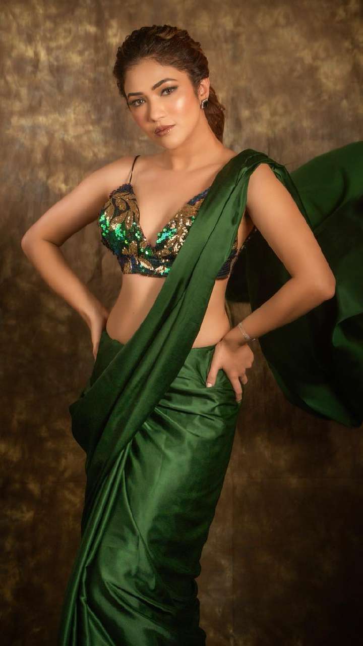 आप भी अभिनेत्री की तरह इस प्लेन साटन साड़ी हैवी वर्क नूडल स्ट्रैप ब्लाउज में खुद को बोल्ड लुक दे सकती हैं। इस तरह की साड़ियों में कर्वी फिगर फ्लॉन्ट होता है।