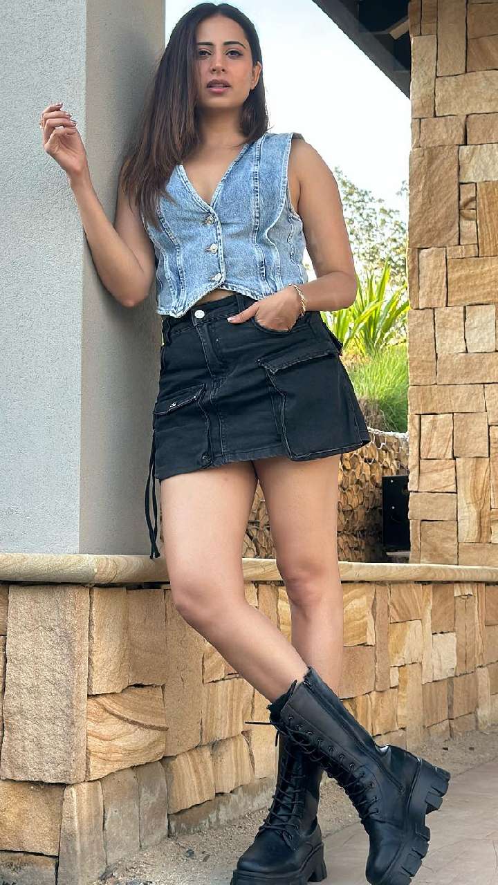 आप इस समर सरगुन की इस डेनिम टॉप ब्लैक स्कर्ट को भी स्टाइल कर सकती हैं। ये काफी क्लासी लुक देगी।