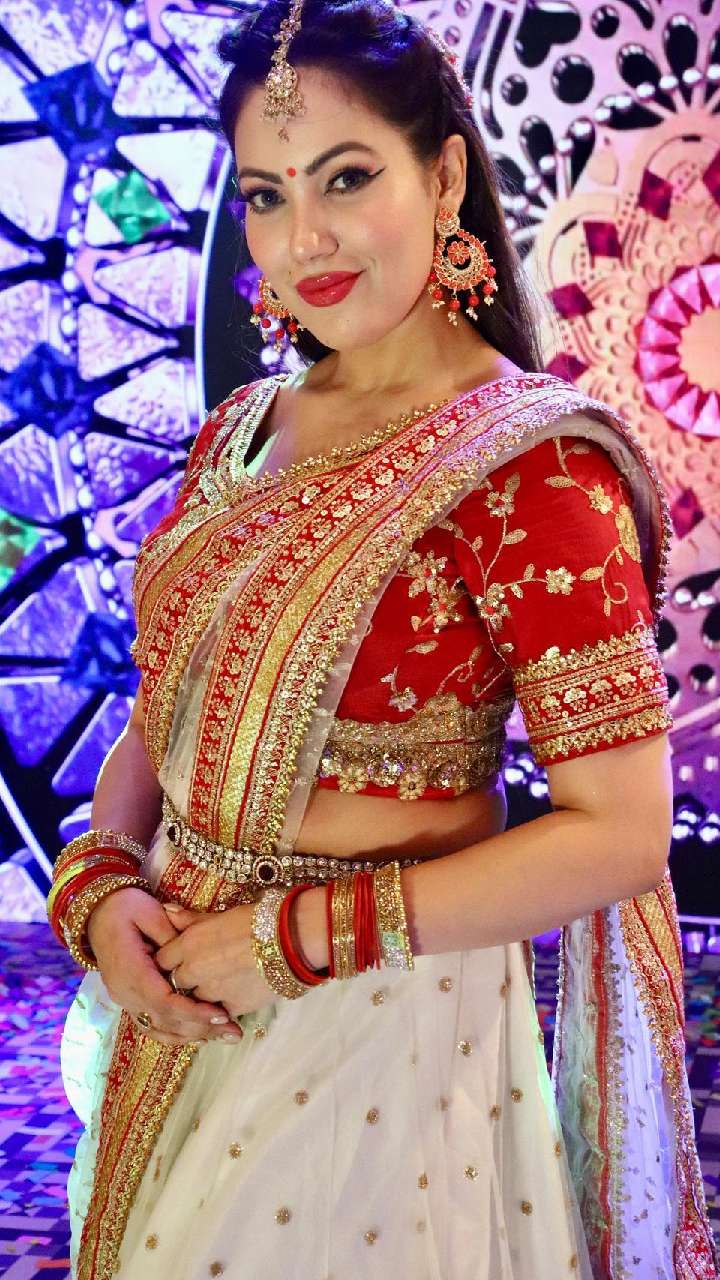 बबिता जी का रेड एंड व्हाइट कॉम्बिनेशन लहंगा लुक काफी शानदार लग रहा है। इसके साथ उनका मेकअप और ज्वैलरी भी जंच रही है।