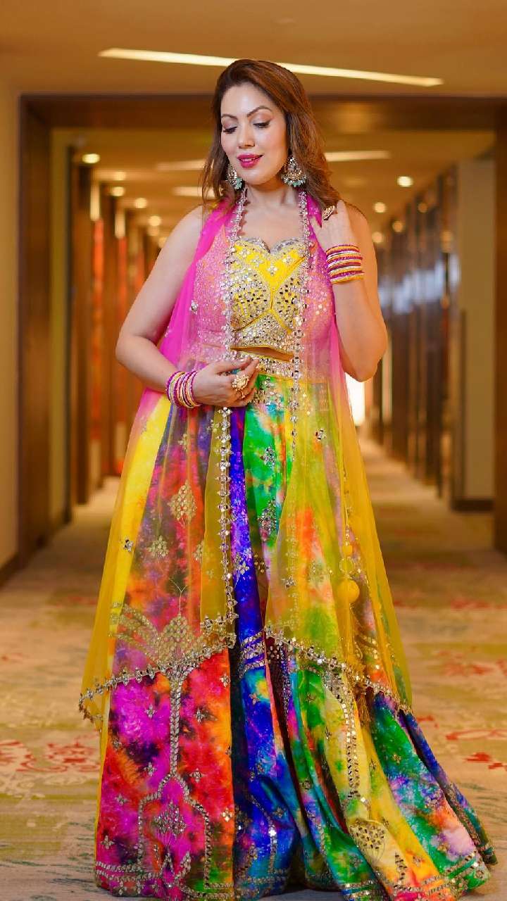 मुनमुन दत्ता का इस फोटो में मल्टीकलर मिरर वर्क लहंगा लुक बेहद खूबसूरत लग रहा है। इसके साथ उन्होंने दुपट्टे को काफी स्टाइलिश तरीके से कैरी किया है।