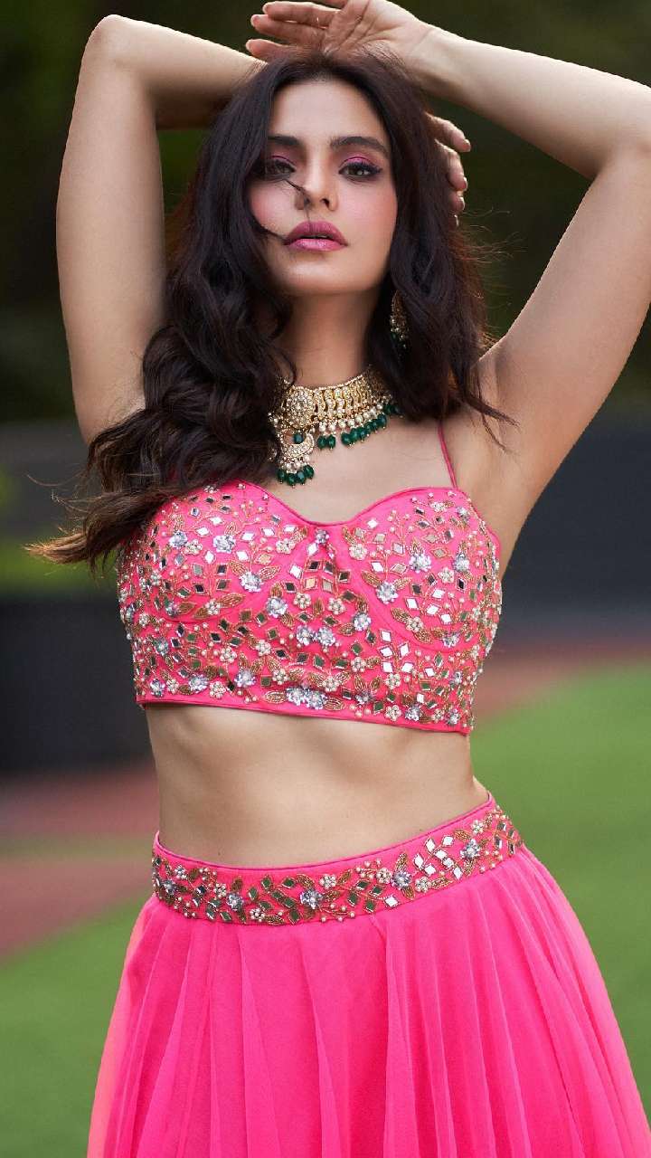 इस तरह के ब्राइट कलर स्ट्रैपी मिरर वर्क चोली लहंगे भी फेस्टिवल पर चार चांद लगा देंगे। एक्ट्रेस का पिंक लहंगा लुक बेहद खूबसूरत है।