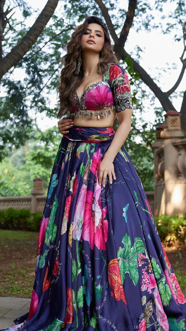 20 प्लस के लिए आमना का फ्लोरल प्रिंट पर्पल लहंगा लुक वी नेक मैचिंग चोली बेस्ट लुक है। आप इसे खुद से स्टिच भी करा सकती हैं।