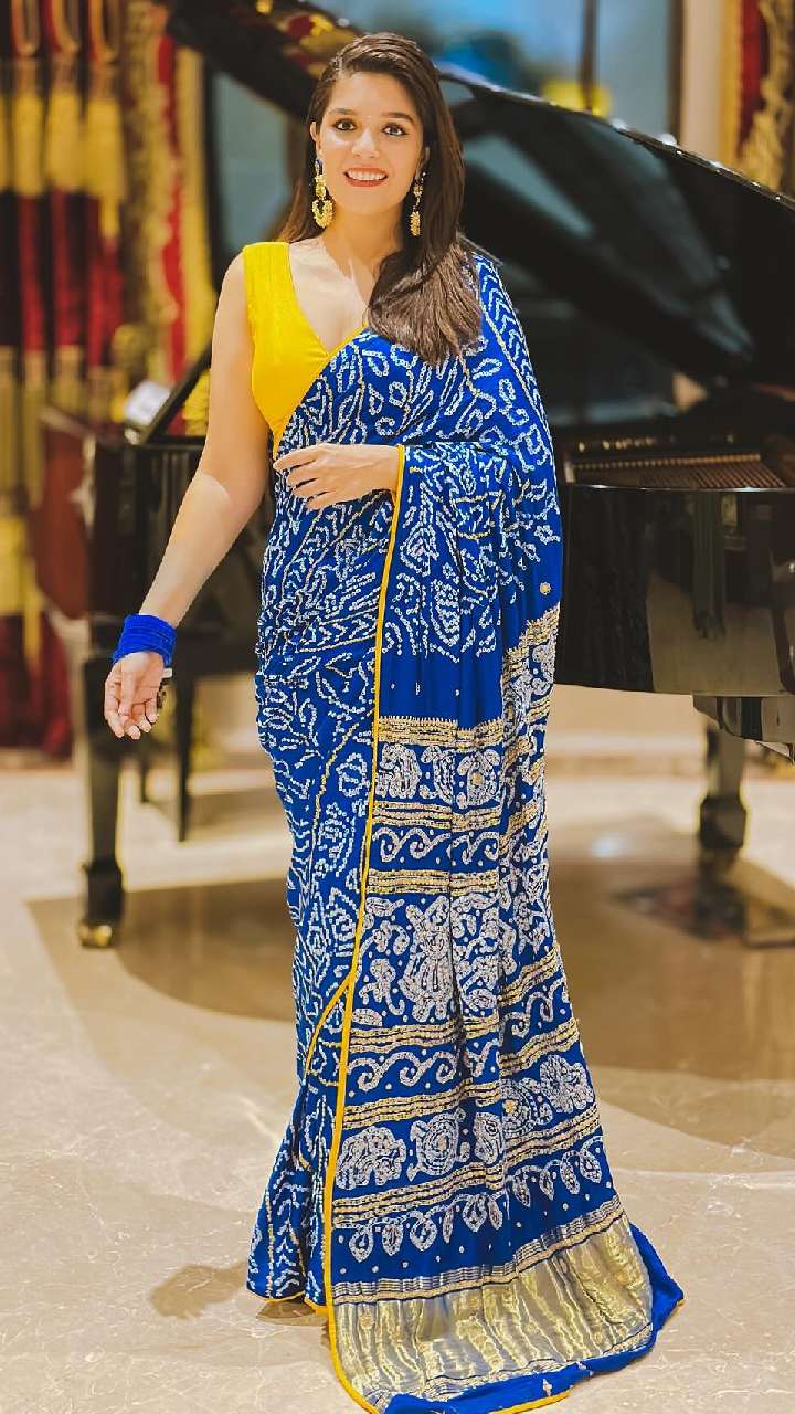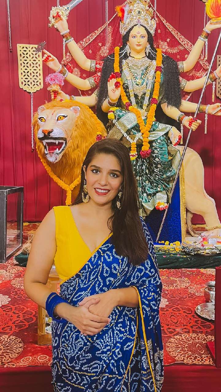 डीवा की ब्लू चुंदरी प्रिंट साड़ी येलो प्लेन ब्लाउज के साथ गॉर्जियस लग रही है। आप भी पूजा के इस लुक को दुर्गा पूजा में स्टाइल कर सकती हैं।