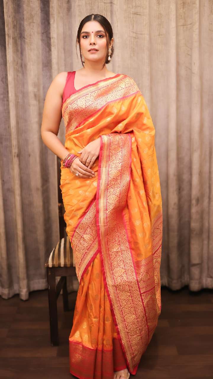 दुर्गा पूजा के लिए डीवा के जैसी ऑरेंज विद रेड बॉर्डर कॉम्बिनेशन वाली साड़ी बेस्ट रहेगी। इसके साथ प्लेन कंटर्स कलर का स्लीवलेस ब्लाउज आपके लुक की शोभा बढ़ा देगा।