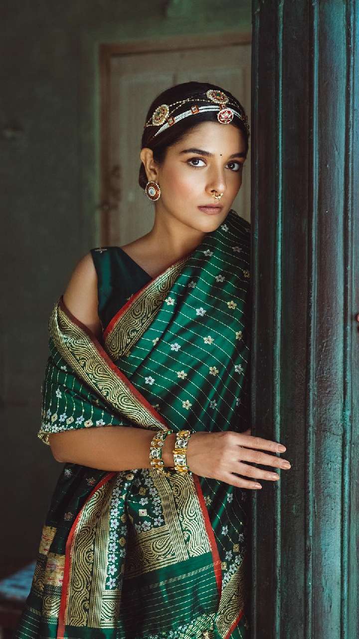 पूजा गौर की ग्रीन सिल्क साड़ी एकदम ट्रेडिशनल टच दे रही है। जिसपर व्हाइट कलर के छोटे छोटे फ्लावर बने हुए हैं। इसके संग उन्होंने माथा पट्टी और सेप्टम कैरी किया हुआ है।