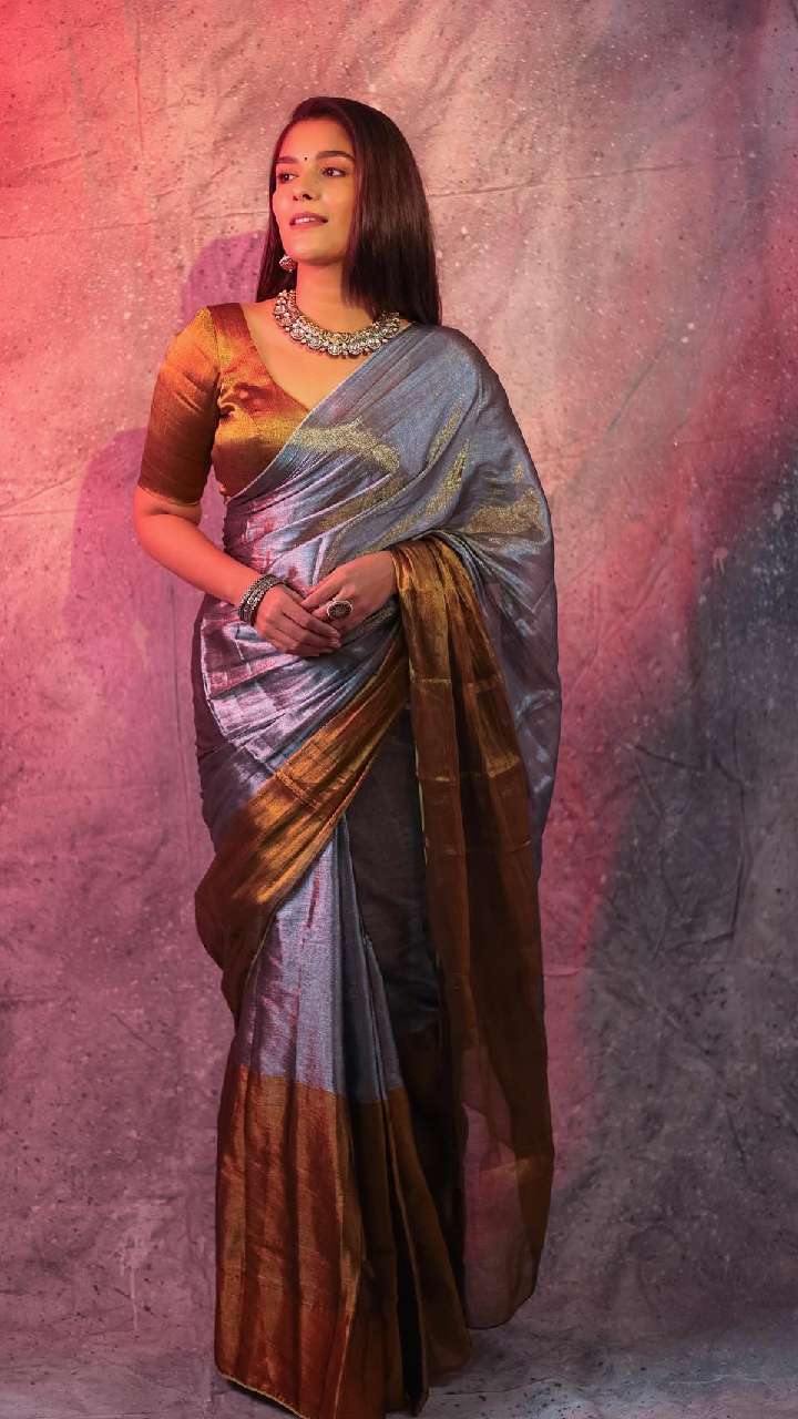 अभिनेत्री की लेवेंडर कलर की फुल जरी वर्क साडी बेहद खूबसूरत लग रही है। इसके संग वन फोर्थ स्लीव्स ब्लाउज गोल्डन ज्वैलरी से उन्होंने अपना लुक कंप्लीट किया है।