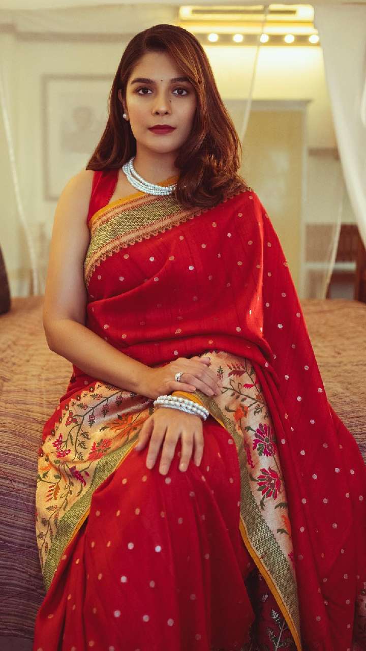 दुर्गा पूजा में लाल रंग काफी अच्छा होता है। ऐसे में एक्ट्रेस की जैसी रेड सिल्वर डॉट फ्लोरल प्रिंट साड़ी बेस्ट ऑप्शन है। आप इसे जरूर ट्राई करें।