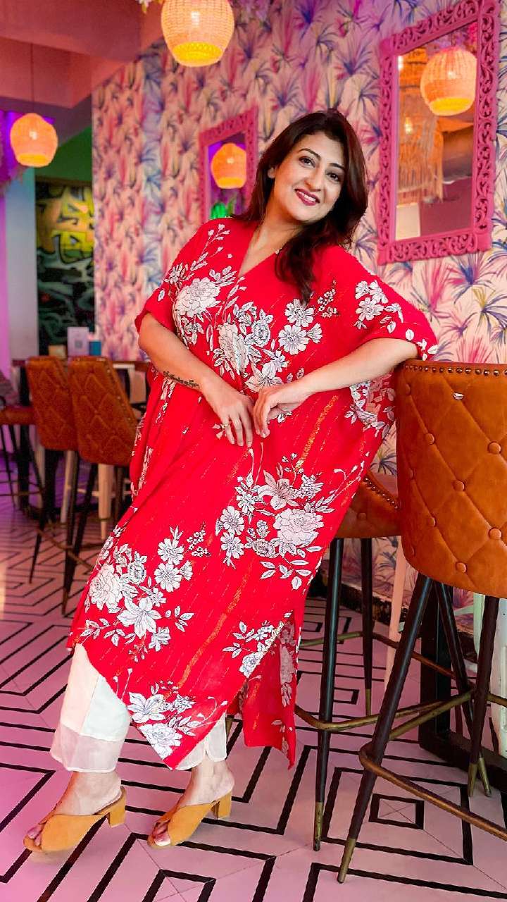 समर सीजन के लिए एक्ट्रेस की रेड प्रिंटेड काफ्तान कुर्ती व्हाइट प्लाजो सेट बेस्ट है। इसे मम्मियां किटी पार्टी में स्टाइल कर सकती हैं।
