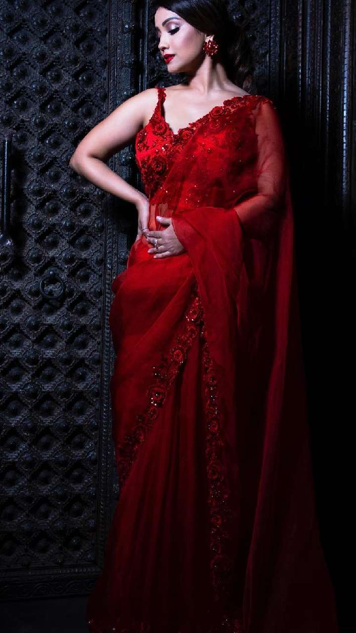 इस रेड कलर की सेक्विन साड़ी नूडल स्ट्रैप ब्लाउज के साथ बन हेयर स्टाइल और नथ पहनें काफी खूबसूरत लग रही हैं।