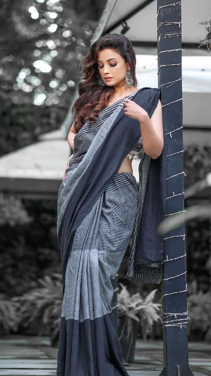 इस ब्लैक कलर की रफल साड़ी को अदा ने बेल्ट से काफी स्मार्ट लुक दिया हुआ है।