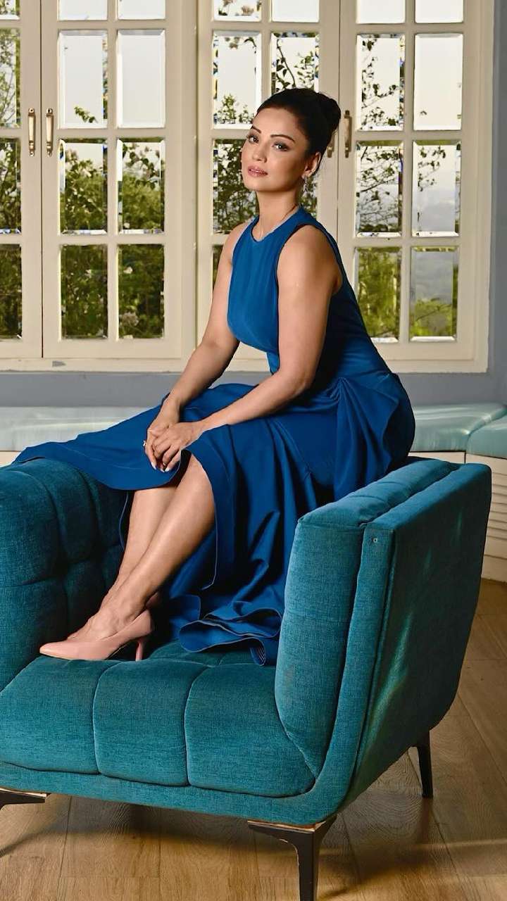 अभिनेत्री का ब्लू हाई स्लिट गाउन बीच वेकेशन के लिए परफेक्ट है। जो आपके लुक को बोल्डनेस से भर देगा।