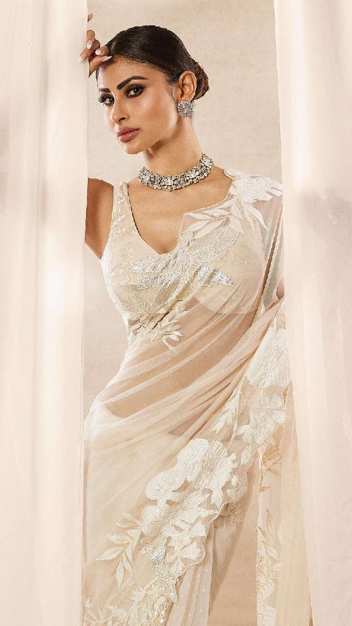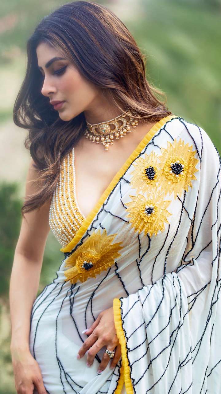 व्हाइट साड़ी के ऊपर सनफ्लॉवर प्रिंट पैच और कट स्लीव्स कंट्रास्ट ब्लाउज में मौनी कहर ढहा रही हैं। आप भी उनके इस लुक को ट्राई कर सकती हैं।