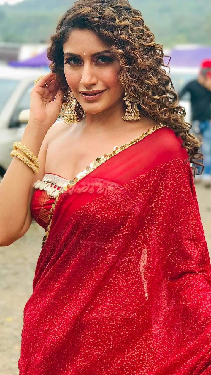 एक्ट्रेस ने सेक्विन साड़ी के साथ वेलवेट क्रिस क्रॉस ब्लाउज और कर्ली हेयर से खुद को अट्रैक्टिव लुक दिया है।