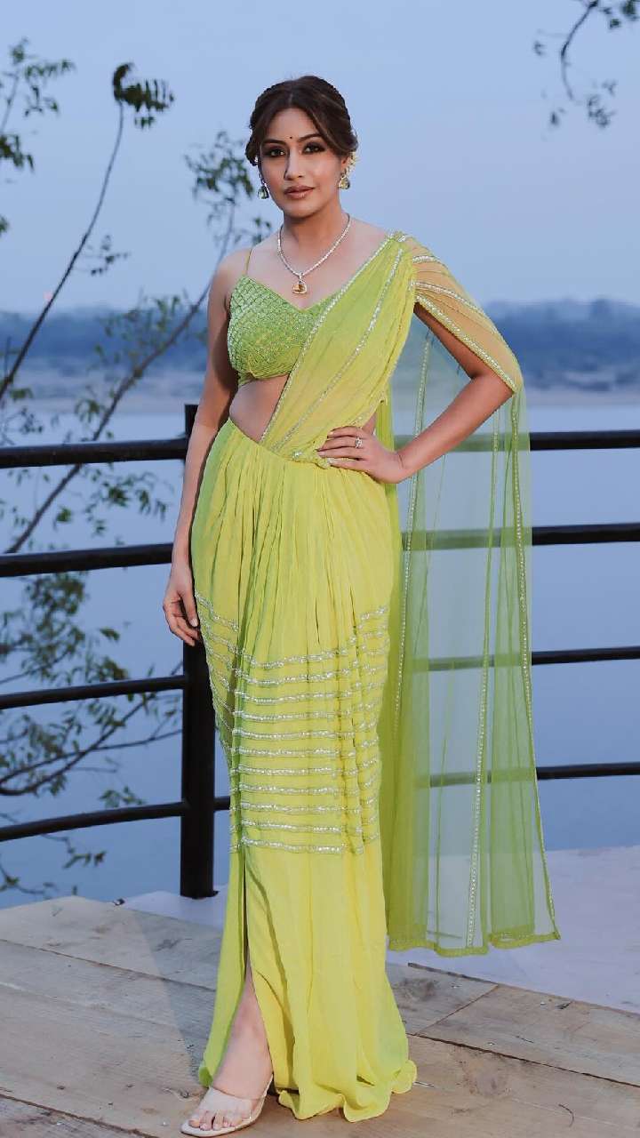 एक्ट्रेस इस लाइट ग्रीन कलर की इंडो-वेस्टर्न साड़ी बन हेयर स्टाइल में काफी ग्लैमरस लग रही हैं। इसके साथ उन्होंने बन हेयर स्टाइल और सिल्वर स्लीक नेकपीस पेयर किया है।