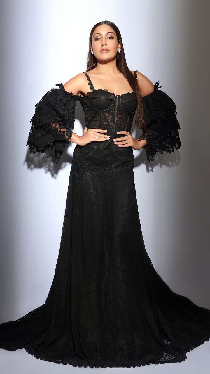 सुरभि चंदना ब्लैक कलर के नेटिड कोल्ड शोल्डर फ्लेयर गाउन में एकदम परी लग रही हैं। पार्टी में इस लुक को देखकर हर कोई आपकी तारीफ करेगा।