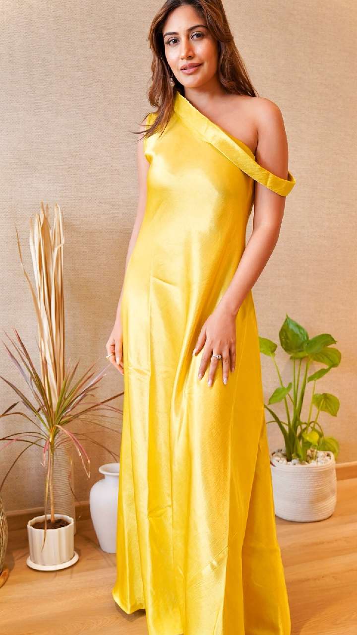 एक्ट्रेस येलो कलर के प्लेन वन शोल्डर साटन गाउन में अपने ग्लैमरस अंदाज से फैंस को दीवाना बना रही हैं। ये आपको पार्टी में क्लासी लुक देगा।