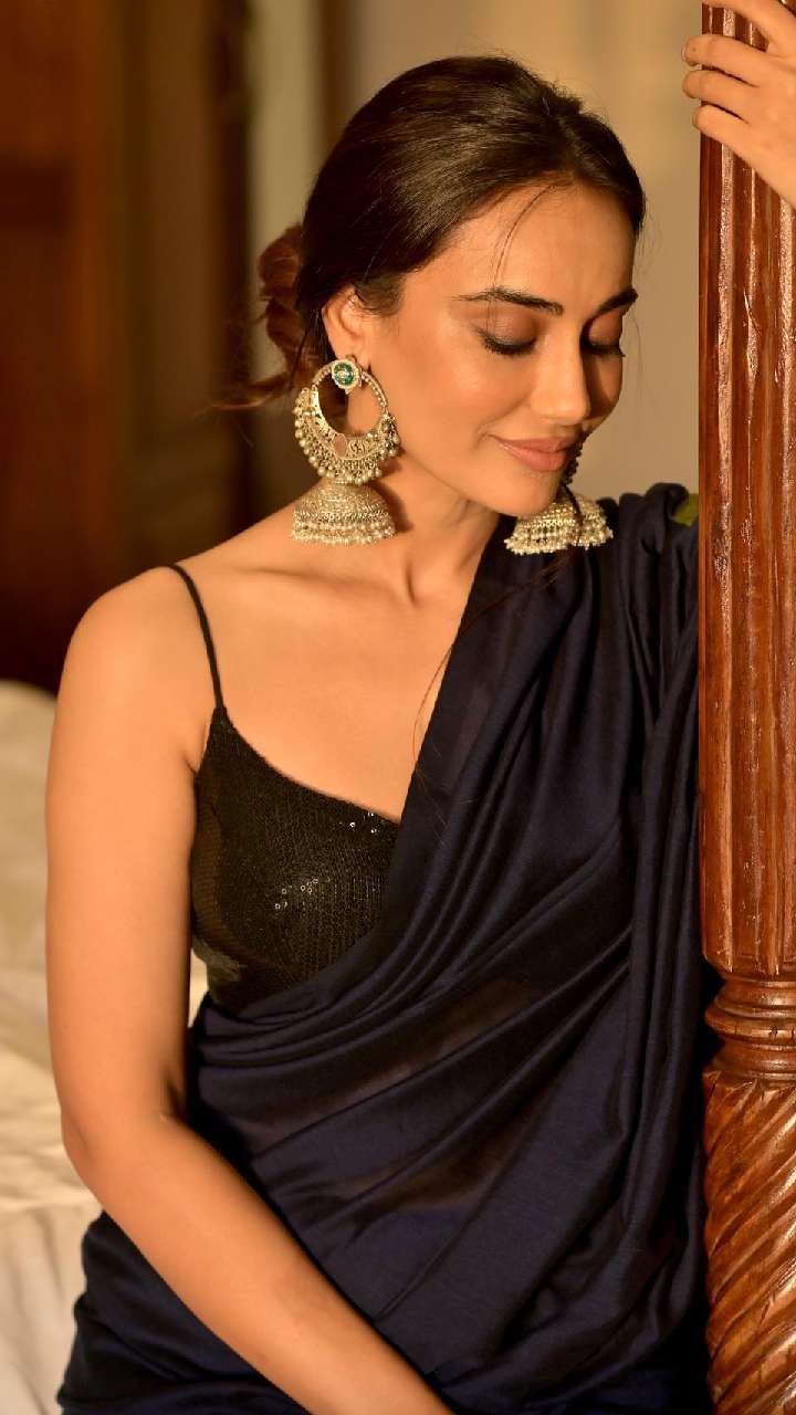 इस ब्लैक कलर की शिमरी साड़ी विद स्ट्रैपी ब्लाउज में सुरभि एकदम वेडिंग गेस्ट लुक दे रही हैं।