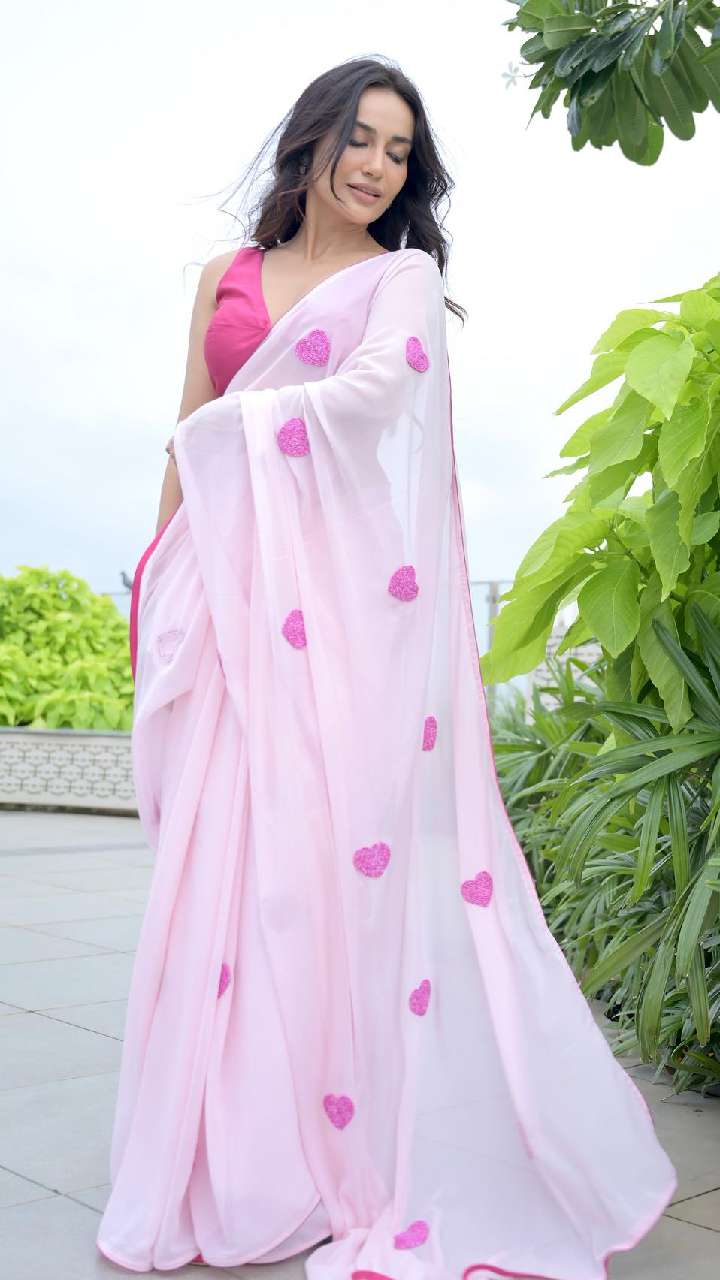 सुरभि का व्हाइट साड़ी विद हार्ट प्रिंट साड़ी लुक काफी खूबसूरत है। इसके साथ एक्ट्रेस ने कंट्रास्ट पिंक ब्लाउज कैरी किया है।