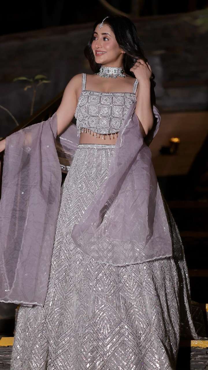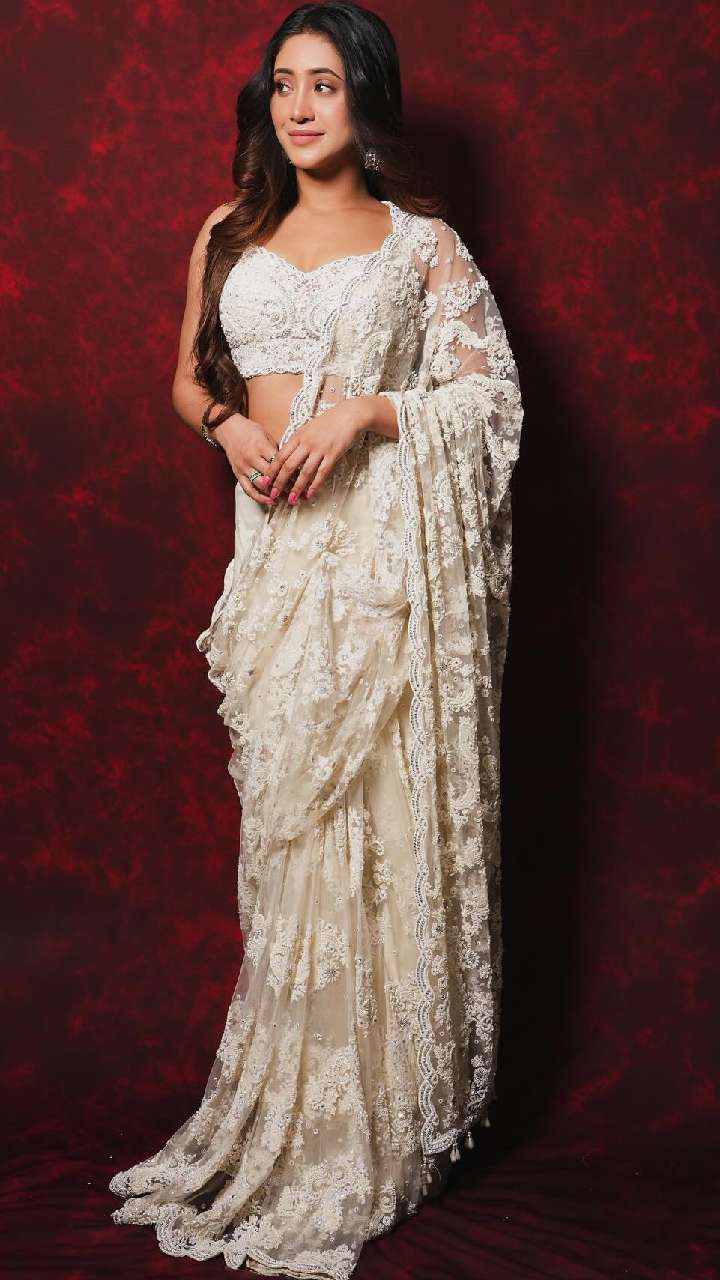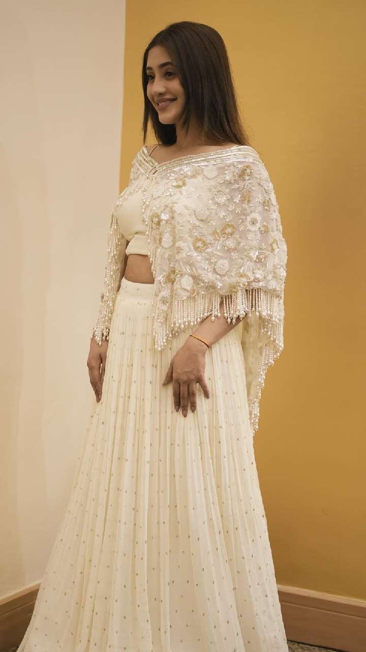 शिवांगी जोशी व्हाइट कलर की स्कर्ट क्रॉप टॉप और श्रग इंडो-वेस्टर्न ड्रेस में खूबसूरत लग रही हैं। वेडिंग के किसी भी फंक्शन में आप इसे ट्राई कर सकती हैं।