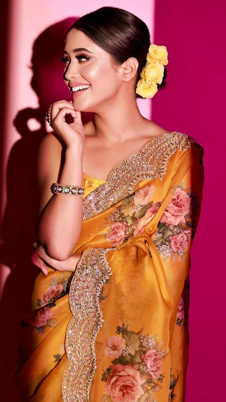 हल्दी फंक्शन में आप शिवांगी की फ्लोरल सिल्क गोल्डन बॉर्डर साड़ी से टिप्स ले सकती हैं। ये आपको ब्यूटीफुल बना देंगी।