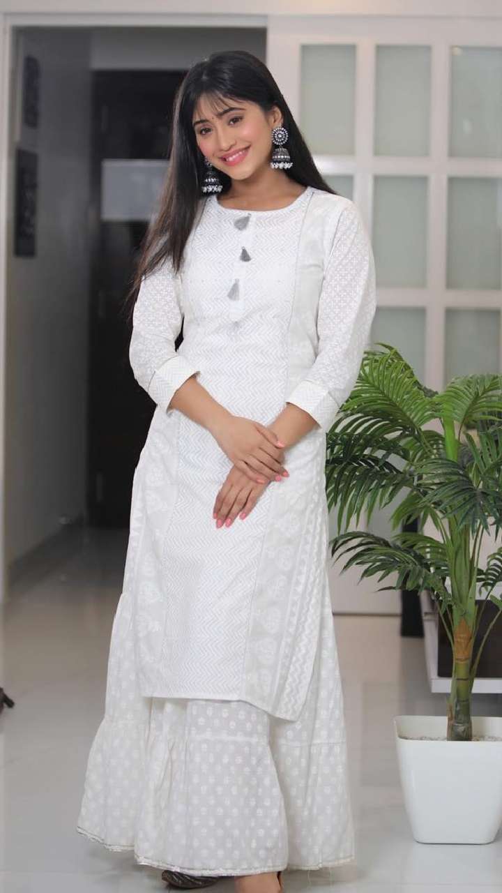 अपने फैशन सेंस को लेकर तहलका मचाए रहने वाली शिवांगी व्हाइट कलर के प्लाजो सूट में प्रिटी लग रही हैं।