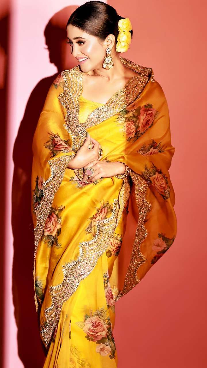 अभिनेत्री इस येलो कलर की गोल्डन बॉर्डर वाली साटन साड़ी में एकदम ट्रेडिशनल अंदाज में नजर आ रही हैं।