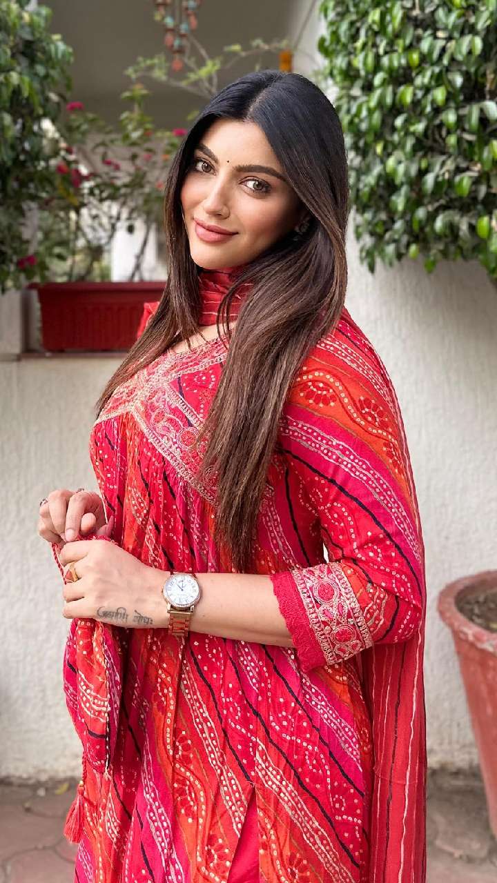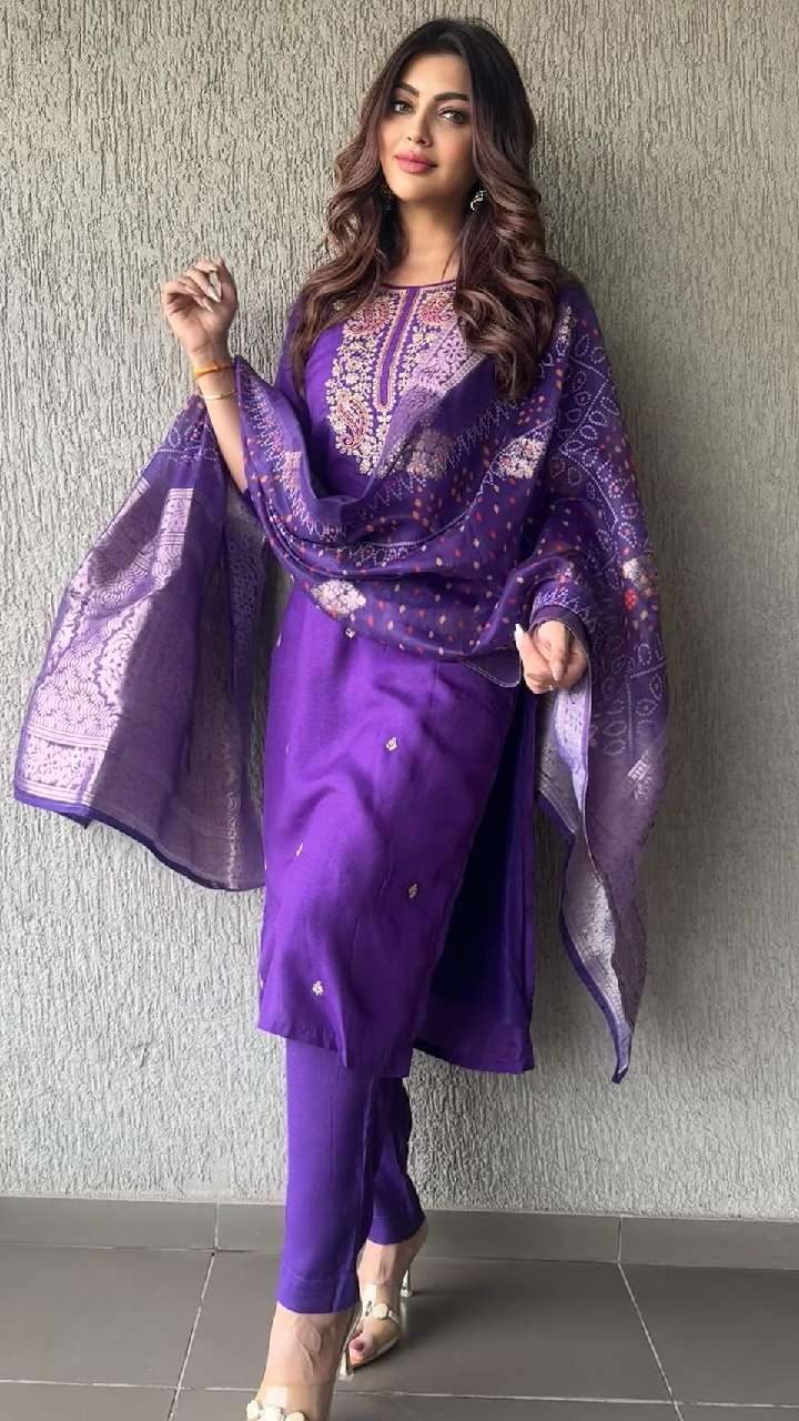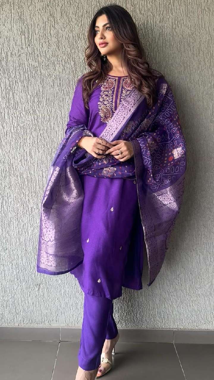 अभिनेत्री का पर्पल सिल्क सूट विद चुनरी प्रिंट दुपट्टा लुक शानदार लग रहा है। इसे आप किसी भी मौके पर पहन सकती हैं।