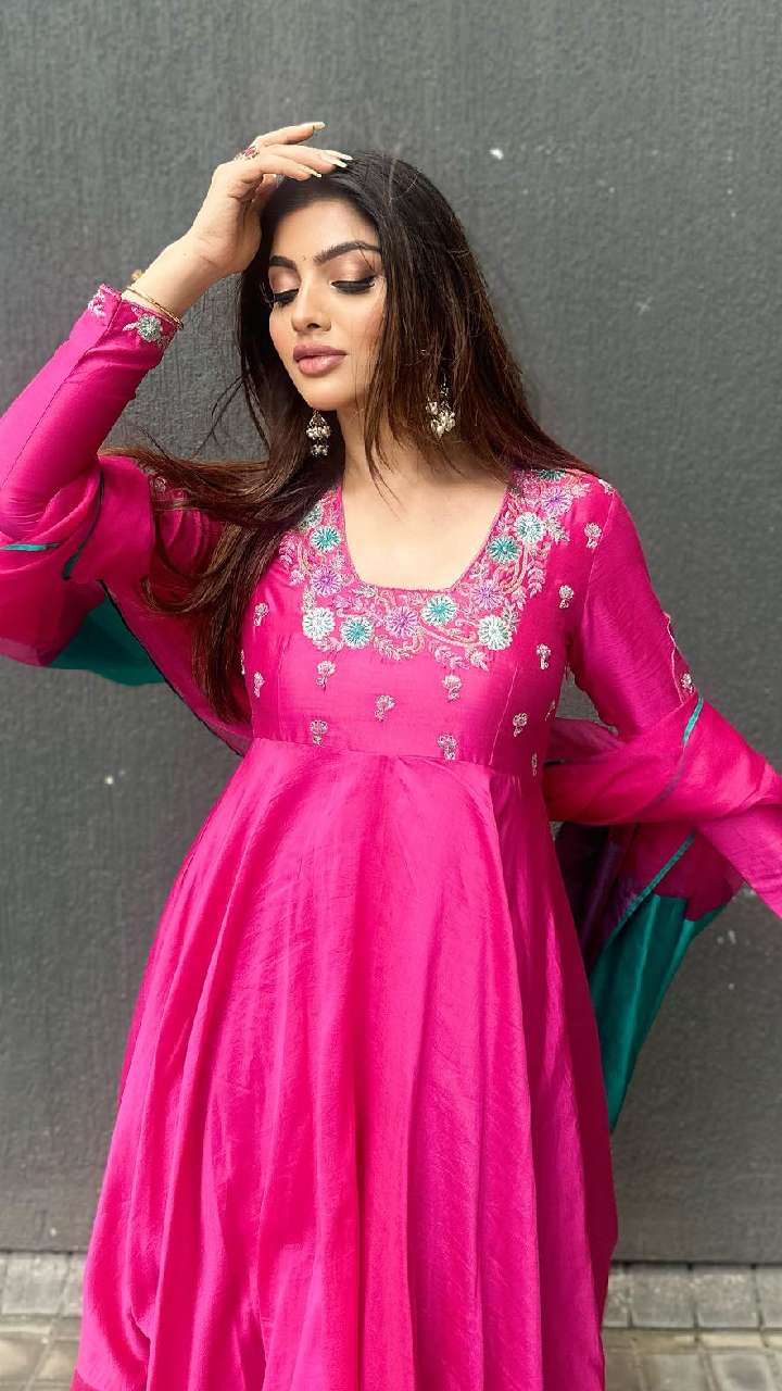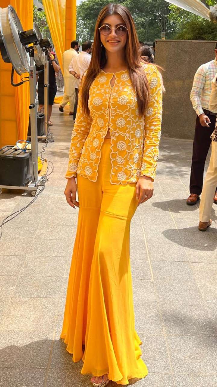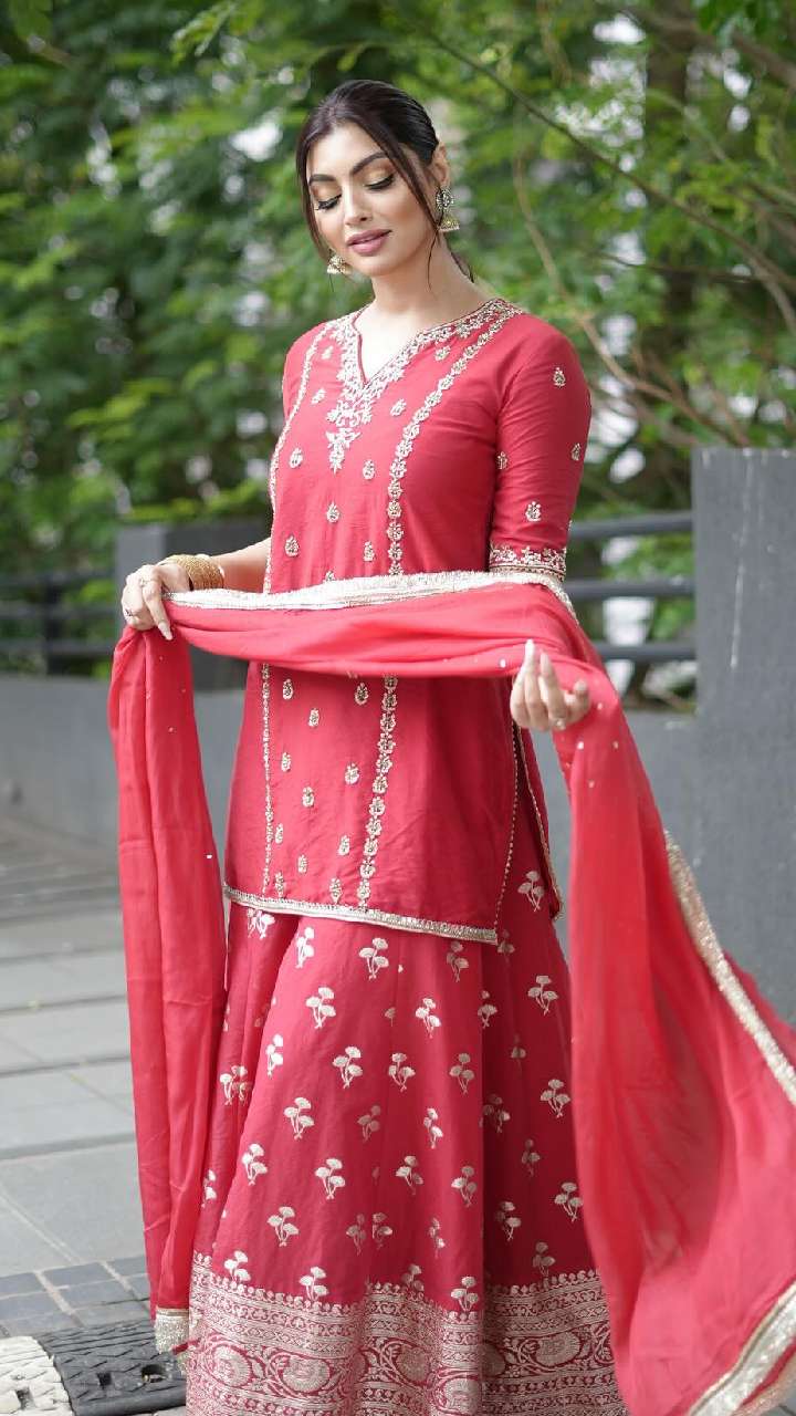 आजकल के फैशन को फॉलो करते हुए आप आकांक्षा के इस पिंक जरी वर्क हैवी घेर शरारा सूट को भी किसी छोटे फंक्शन पर कैरी कर सकती हैं।