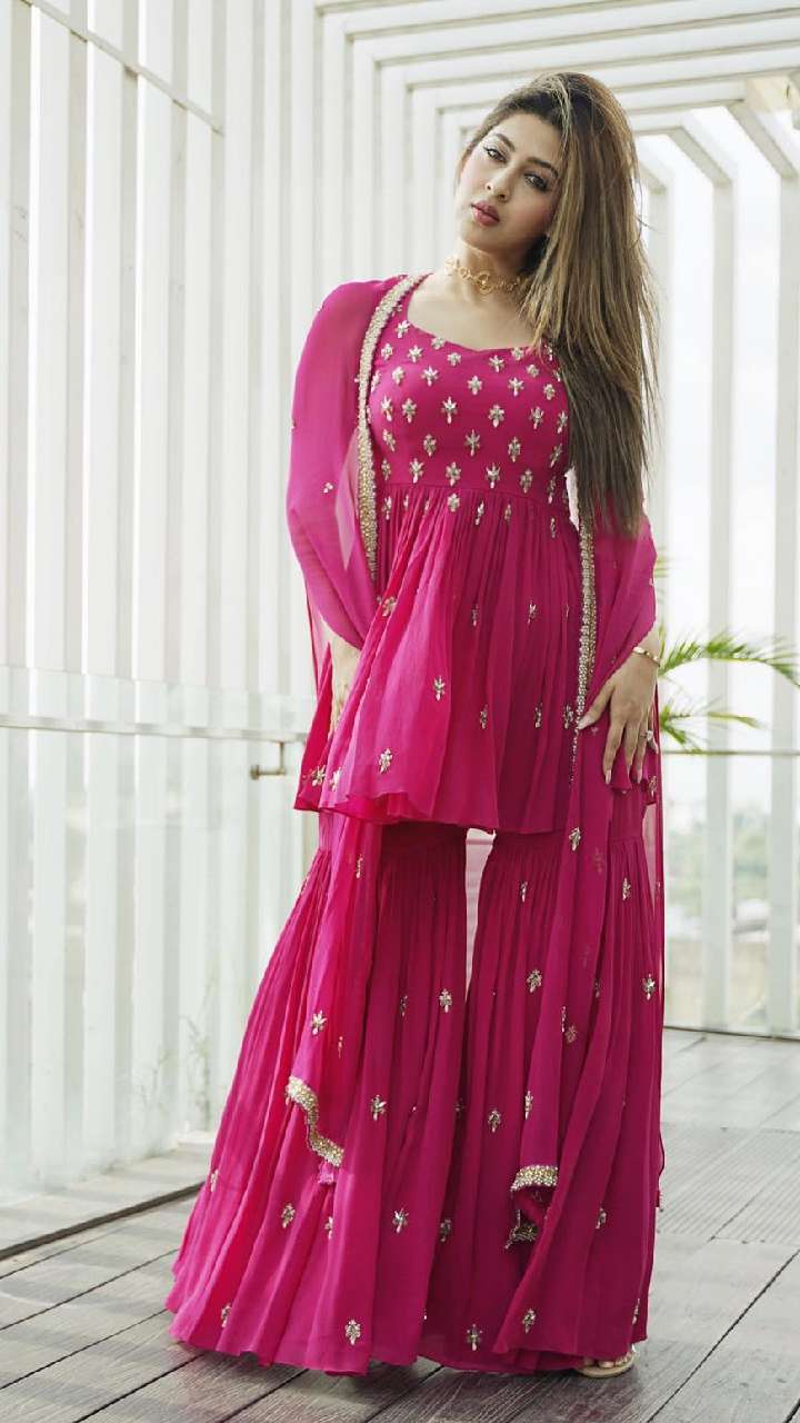 सोनारिका का पिंक कट दाना वर्क शरारा सूट काफी ब्यूटीफुल लुक दे रहा है। सिंपल लुक के लिए आप इसे भी ट्राई कर सकती हैं।