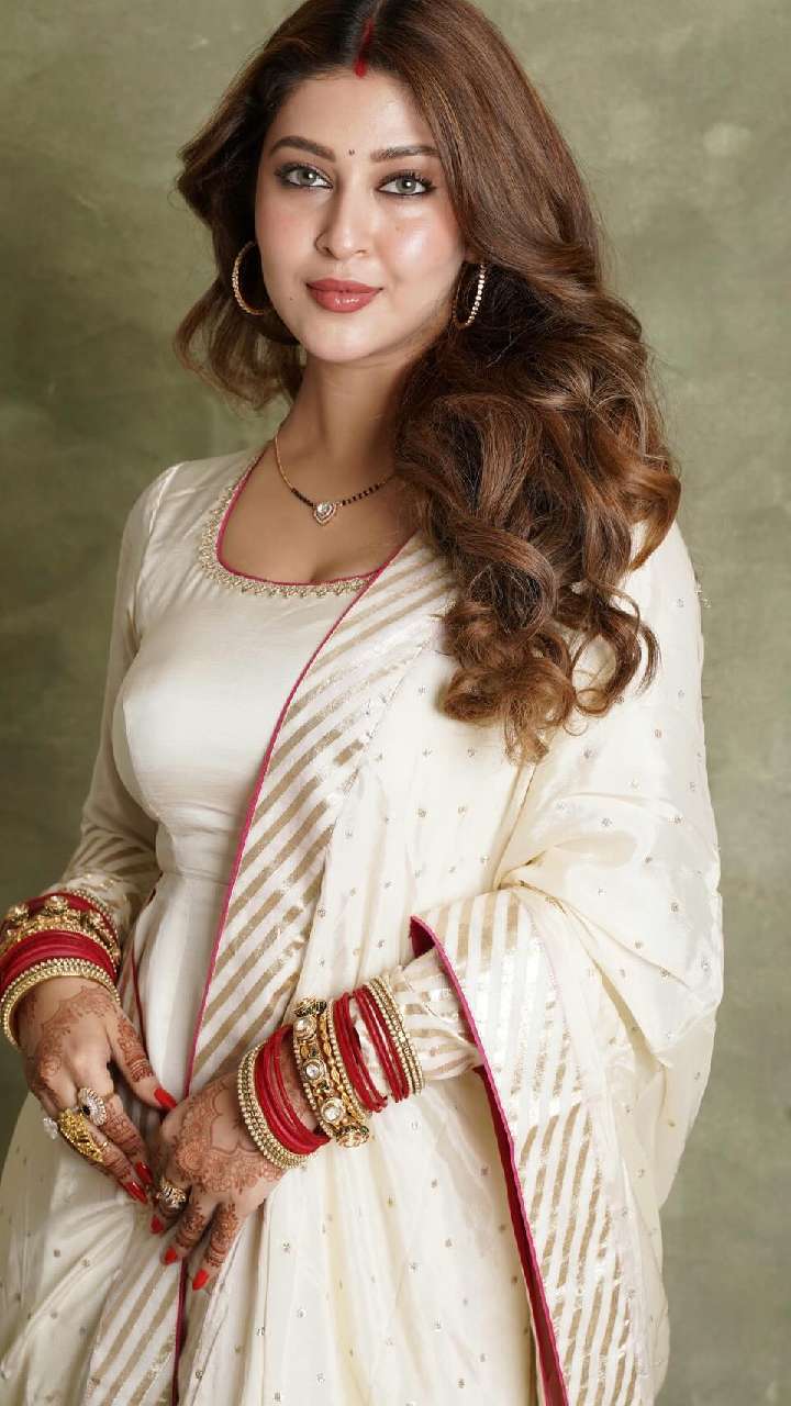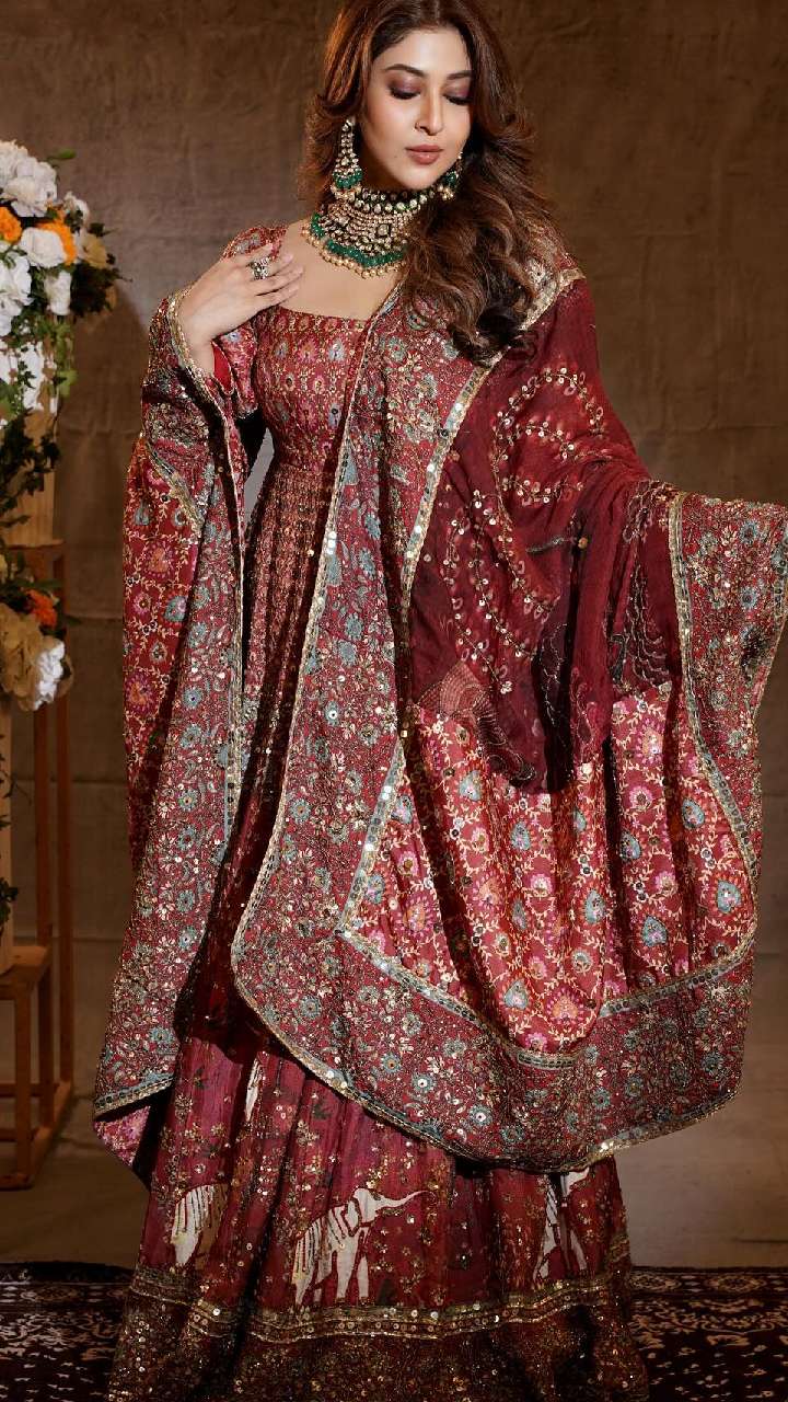 सोनारिका मरून कलर के हैवी वर्क अनारकली सूट में बेहद गॉर्जियस लग रही हैं। न्यूली मैरिड के लिए के लिए ये बेस्ट लुक है।