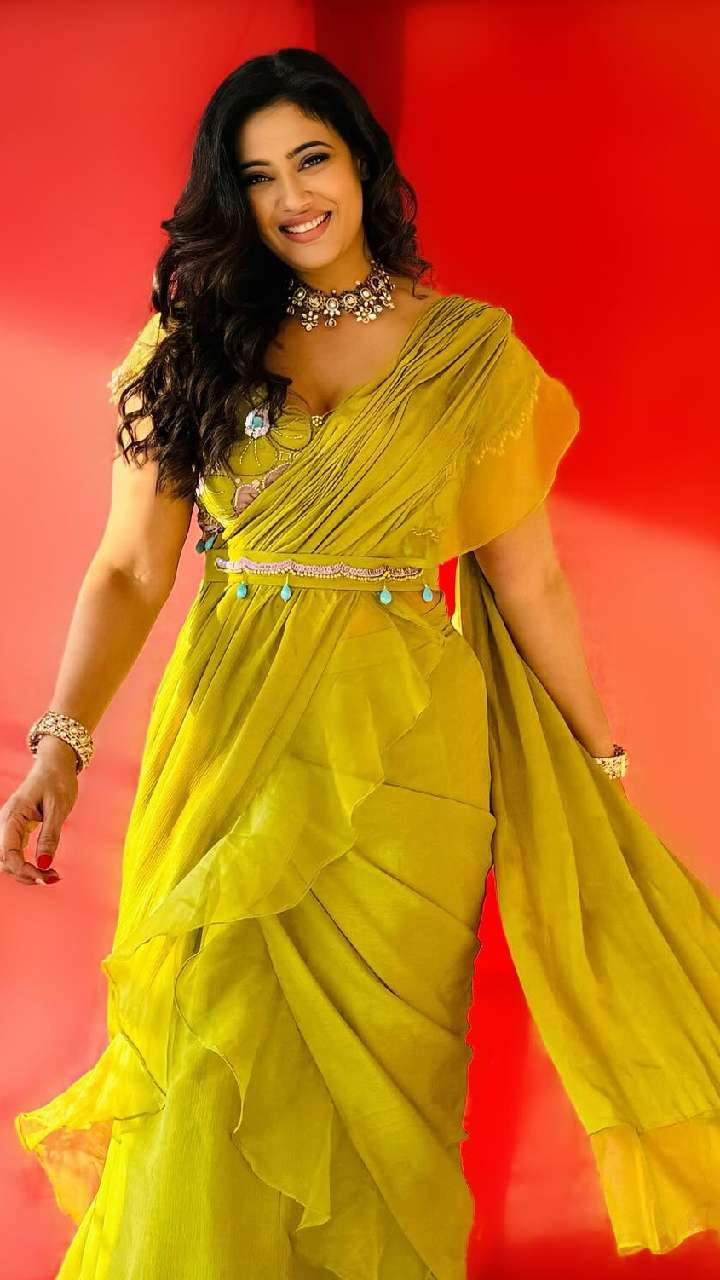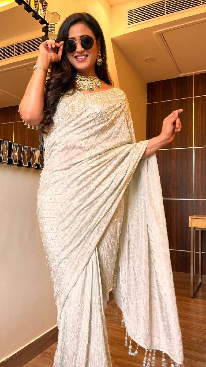 Shweta इस साड़ी में गॉर्जियस के साथ-साथ बेहद स्टाइलिश लग रही हैं। साड़ी में बेल्ट का लुक देखने में बेहद अट्रैक्टिव लग रहा है। आप इसे मेसी बन के साथ स्टाइल कर सकती हैं।